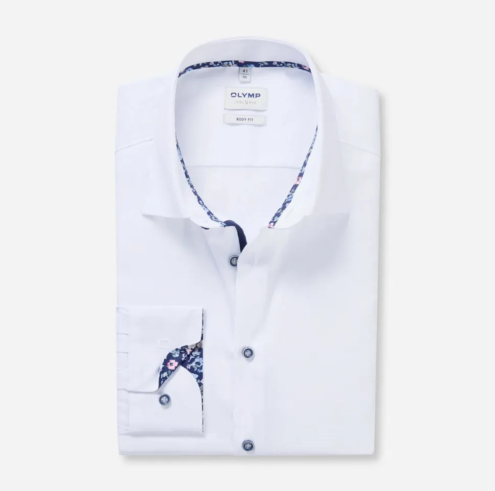 OLYMP Level Five Body Fit Contrast Trim Floral – on klassinen ja tyylikäs miesten valkoinen kauluspaita, joka sopii niin arjen smart-casual-lookiin kuin siistimpään pukeutumiseen. Body fit -leikkaus seuraa vartalon linjoja tyylikkäästi ja istuu huolitellusti. Paidassa on Kent-kaulus, joka antaa ajattoman ja monikäyttöisen ilmeen.