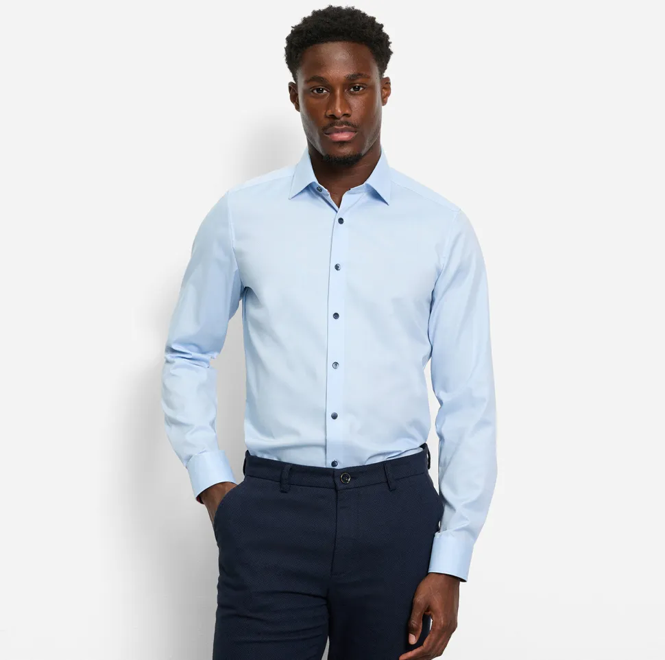 OLYMP-business-paita, jossa on muodikkaat kontrastivärit kauluksessa ja hihansuissa, sopii täydellisesti yhteen rentojen tyylien kanssa. Hienostunut ja minimaalisesti joustava puuvillakangas on ihoystävällistä, muotonsa säilyttävää ja hengittävää. Paidassa on New York Kent -kaulus ja se on erityisen helppo silittää.