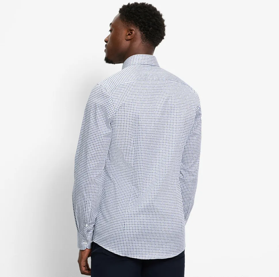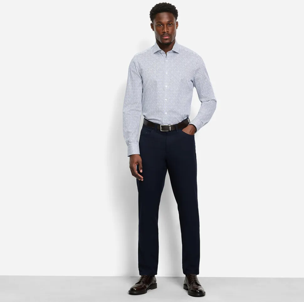 Tämä miellyttävän sileä Level Five Body Fit -business-paita on valmistettu joustavasta Comfort Stretch -materiaalista, se on muotonsa säilyttävä, ihoystävällinen ja erityisen helppohoitoinen. Graafisen minimalistisen muotoilunsa ansiosta se korostaa mitä tahansa muodikasta toimistotyyliä sekä huomaamattomasti että tehokkaasti. Tyylikäs ja rento, maskuliinisella Royal Kent -kauluksella ja pyöristetyllä helmalla.