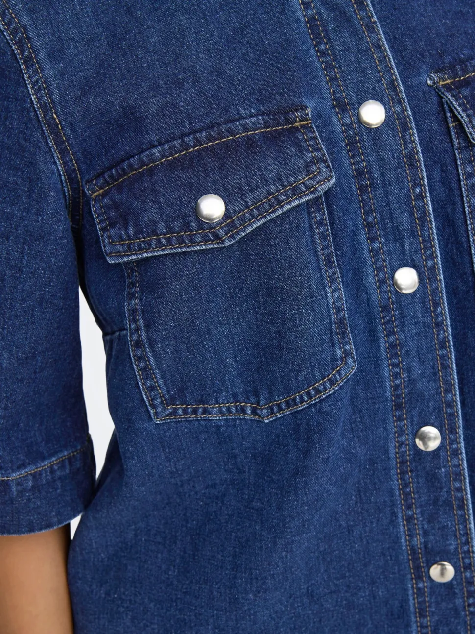 Valmistaudu töihin, kouluun tai vapaa-ajan menoihin farkkumekolla, joka yhdistää ajattoman tyylin ja käytännöllisyyden. Pehmeä ja hengittävä puuvilla tuntuu miellyttävältä päällä, ja mekko on helppo yhdistää erilaisiin asusteisiin. Lyhyt Regular fit -malli, rintataskut ja painonappikiinnitys tekevät mekosta toimivan ja tyylikkään valinnan arkeen. Hellävarainen denim-pesu tuo tuotteelle tumman ja modernin ilmeen.