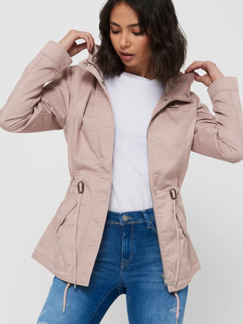 Onlyn kevyt parkatakki toimii välikausitakkina niin keväällä kuin syksyllä. Lyhytmallinen kevättakki, jossa on huppu ja hieman korotettu kaulus. Vetoketjukiinnitys ja nappilista, joka sujaa tuulelta. Vetoketjullinen rintatasku ja lpälälliset etutaskut. Vyötäröllä kiristysnauha. Takaa helma pyöristetty.