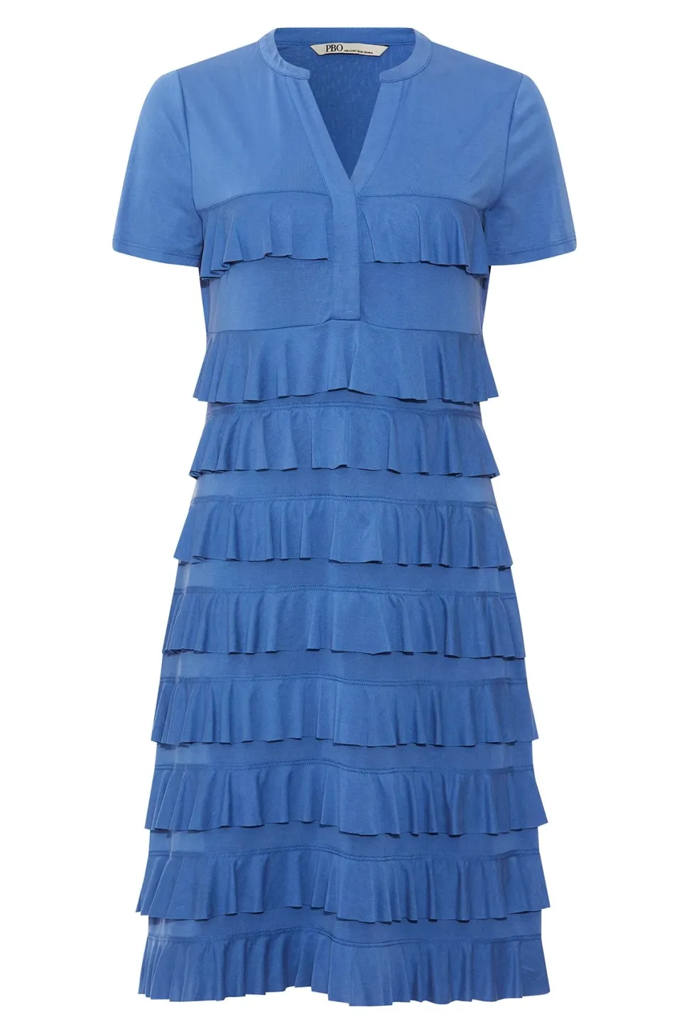 Lyhythihainen mekko, jossa v-pääntie ja röyhelöyksityiskohdat.