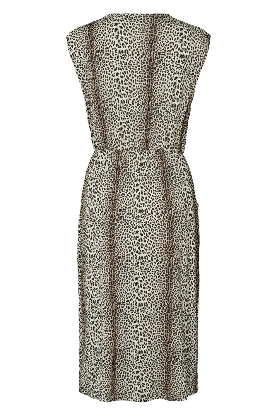 PBO:n kaunis täyspitkä mekko. Mekossa on kaunis leopardikuvio ja v-pääntie. Vyötäröllä ja olkasaumassa on rypytykset ja molemmilla sivuilla taskut. Kangas on paksua viskoosia ja joustaa.