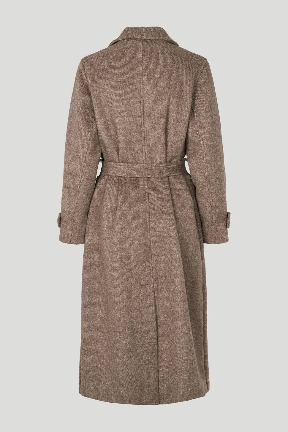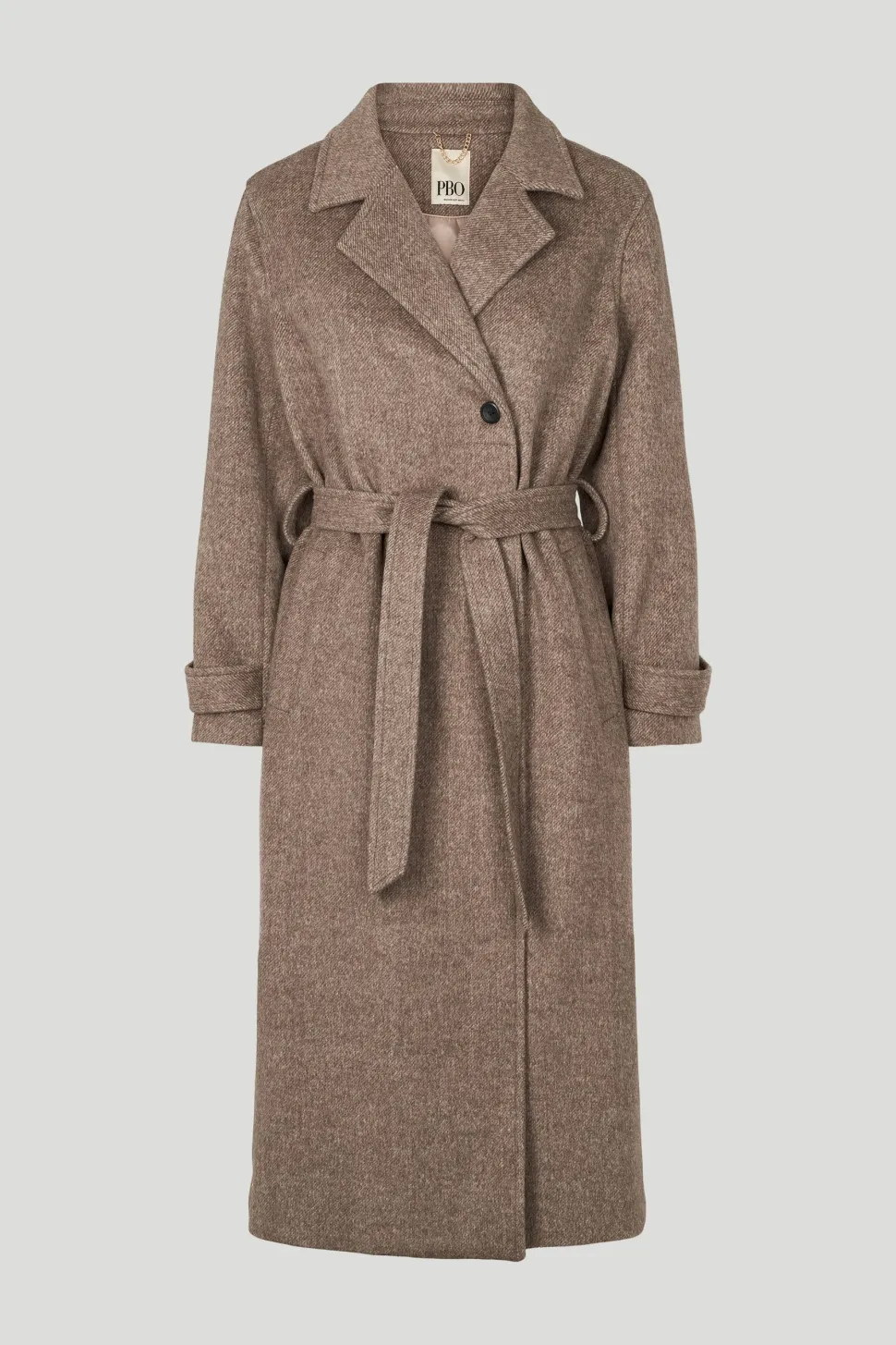 Sabotage on pitkä, kietaisuefektillä varustettu takki, jossa on selkeä vyötärö ja leveä kaulus. Vyökiinnitys ja yksi nappi antavat elegantin ilmeen.