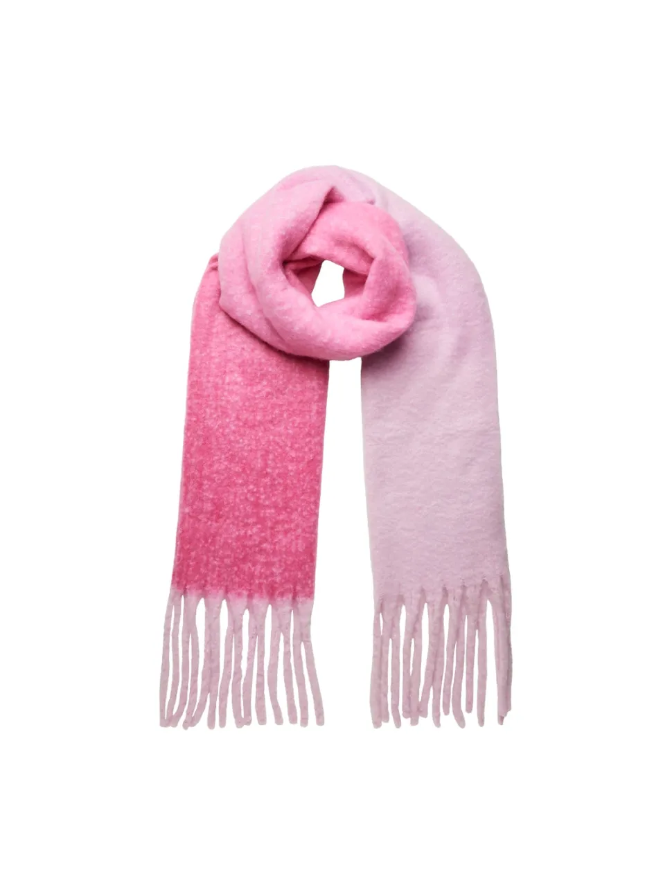 Pitkä, muhkea kaulaliina, jossa on hapsut päissä.
