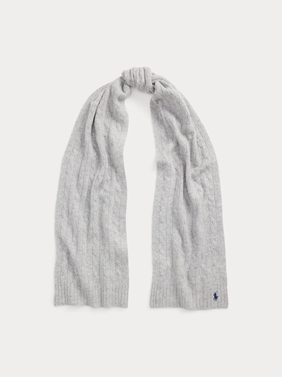 Ylellisestä villan ja kashmirlangan sekoituksesta valmistetussa huivissa on Ralph Laurenille tyypillinen palmikkoneulos, ja sitä korostaa kirjailtu poni-kuviomme.
