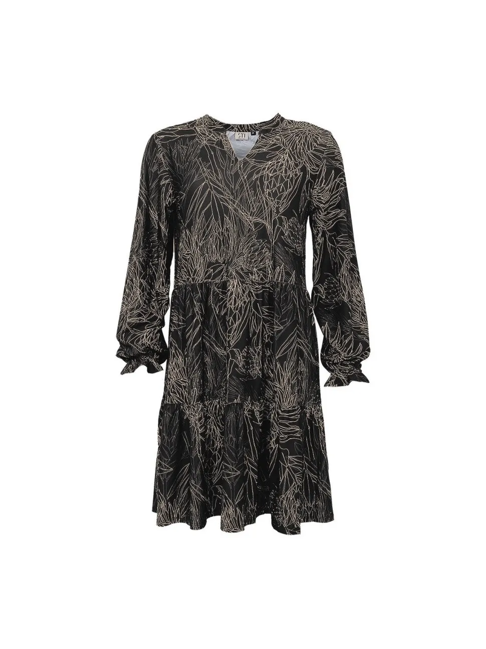 Naisten A-linjainen mekko, jossa kiva frillahelma. Tunikassa on V-pääntie ja pitkät hihat, joissa hihansuissa kuminauhat. Helppo vaate niin arkeen kuin juhlaan.