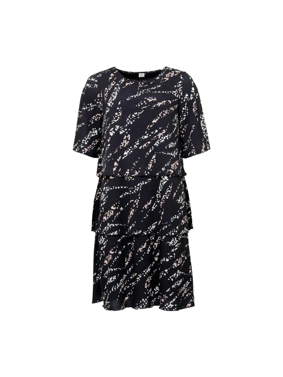 Trikoomekko O-pääntiellä, 3/4 pituisella hihalla ja kerrostetulla helmalla.