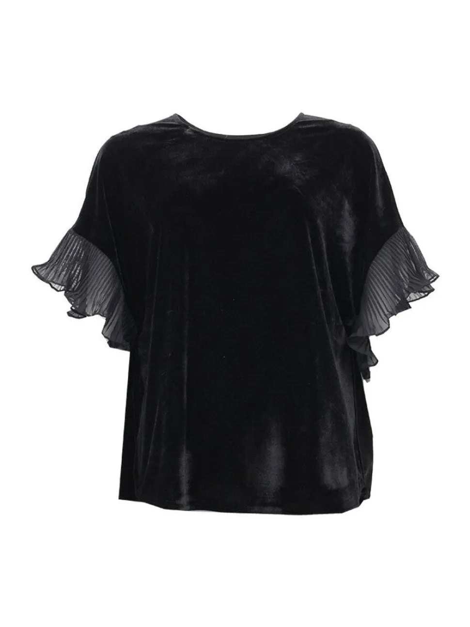 Naisten juhlava velourpusero, jossa lyhyet pliseeratut sifonkihihat. Puserossa O-pääntie. Suora väljästi laskeutuva malli.