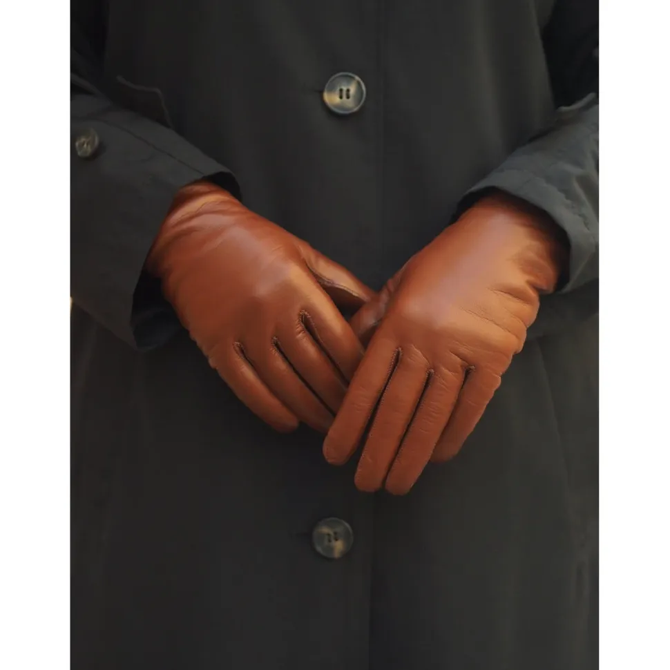 Klassinen naisten konjakin ruskea nahkakäsine. Käsityönä valmistettu ajaton käsine tarkkaan valituista luonnonmateriaaleista. Ajaton malli ja minimalistinen muotoilu. Huolella valitut materiaalit ja artesaanikäsityö tekevät näistä käsineistä ulkopukeutumisen vakion.