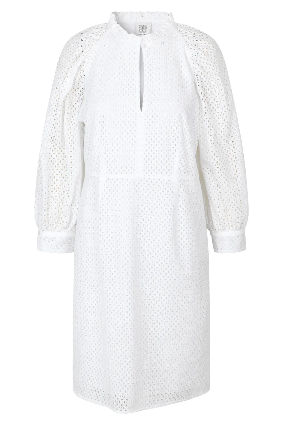 Second Femalen mekko on brodeerattua puuvillakangasta, jossa on pystykaulus nappikiinnityksellä. Mekossa on leveähkö raglan-hiha. Kotelomekko on vyötäröstä hieman kavennettu ja helma yltää lähelle polvea. Mitoituksena normaali.