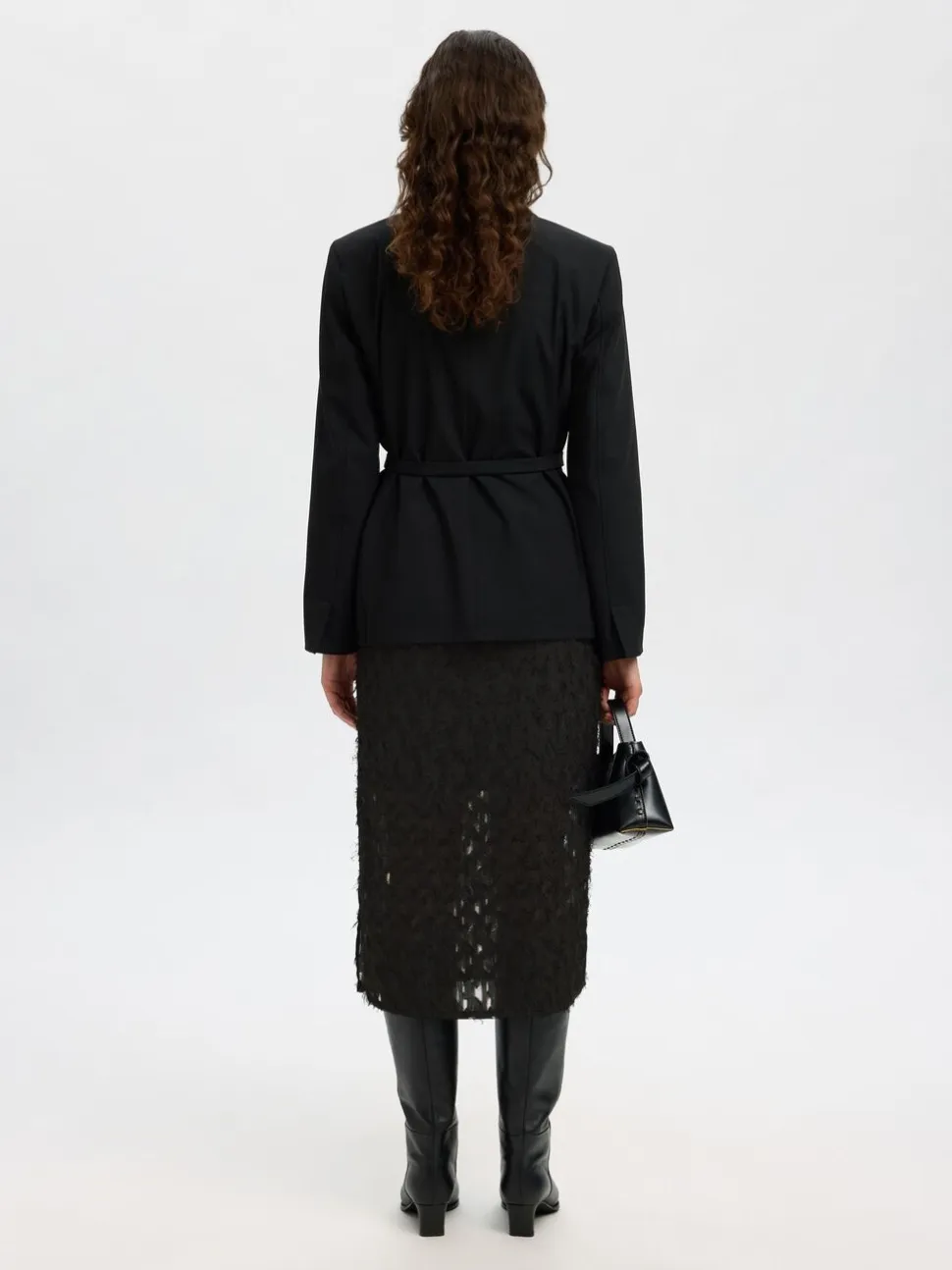 Tee tyylikäs katseenvangitsija tällä midi-pituisella hameella. Se on läpikuultava, teksturoitu jacquard-kuvioinen ja näyttää upealta mustan bodyn ja ylisuuren bleiserin kanssa. Täydennä asusi slingback-korkokenkien kanssa.
