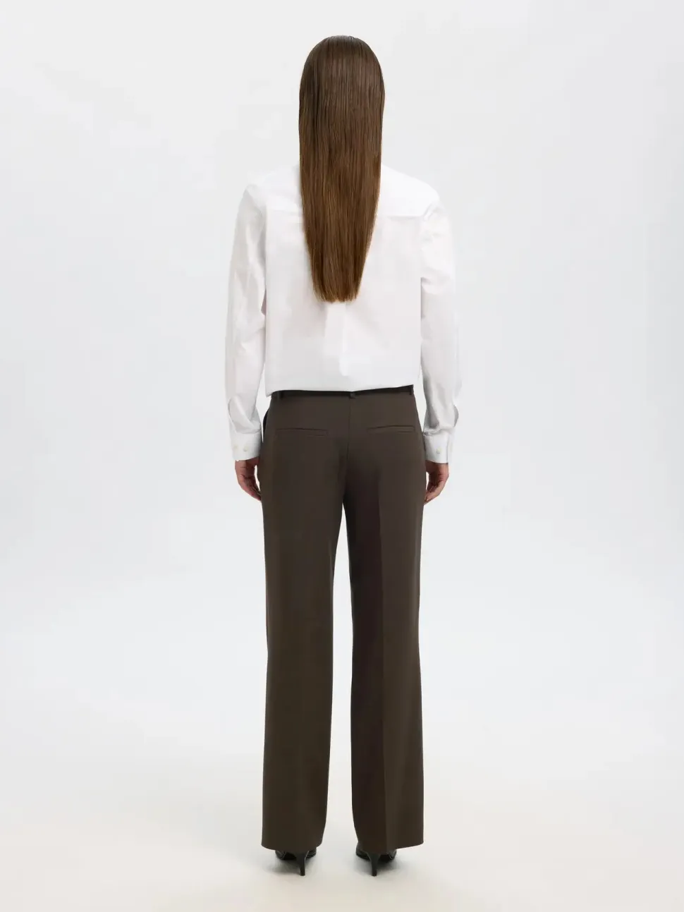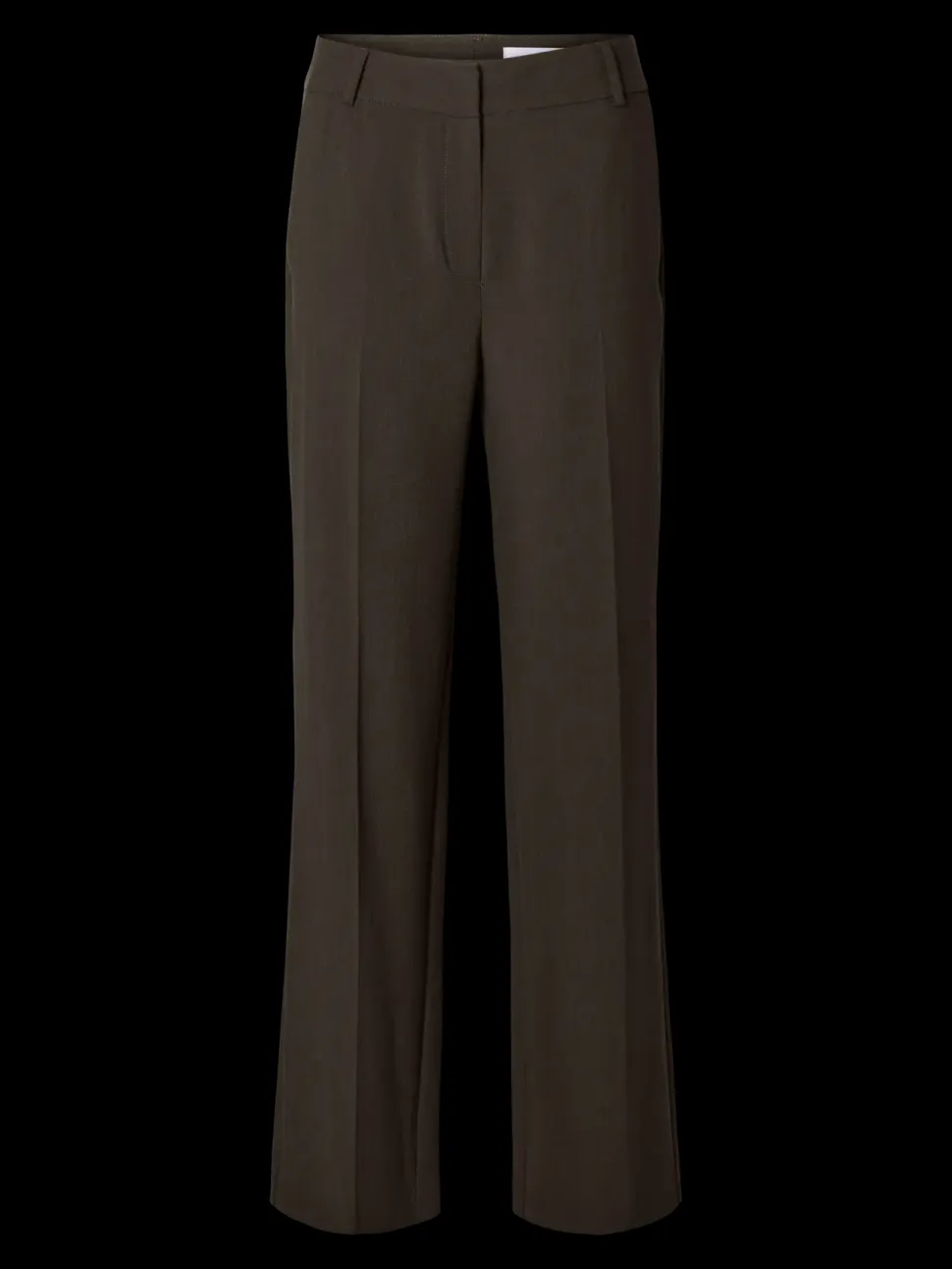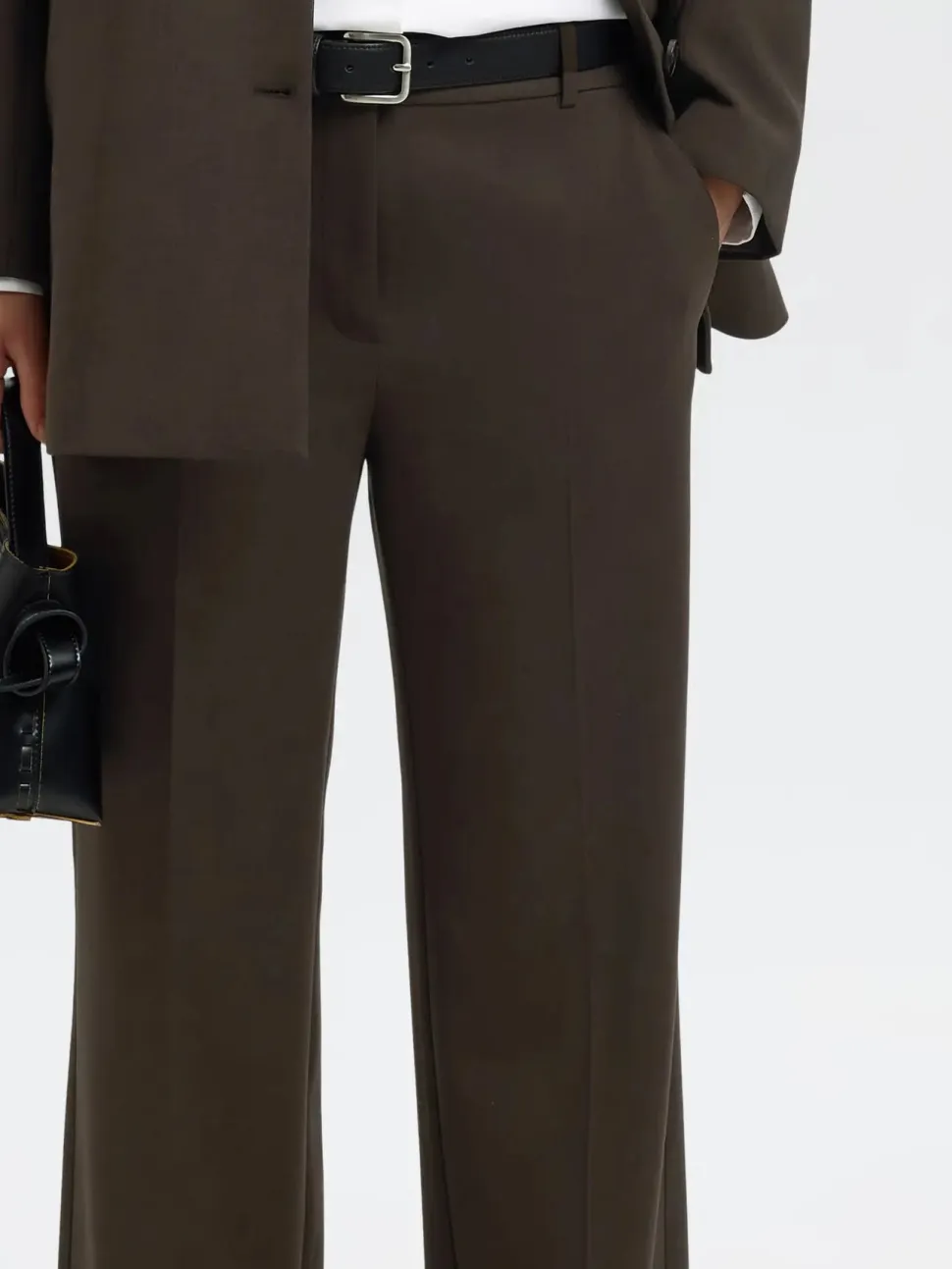 Nämä räätälöidyt leveälahkeiset housut ovat kaikki mitä tarvitset näyttääksesi tyylikkäältä ja ammattimaiselta. Housuissa on levenevät lahkeet, keskikorkea vyötärö, vetoketjullinen sepalus hakaskiinnityksellä, vyölenkit, viistot sivutaskut ja terävät takataskut.