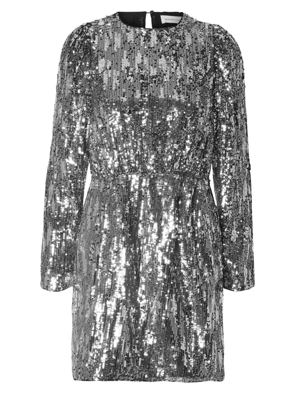 Pitkähihainen paljettimekko. Pyöreä pääntie.