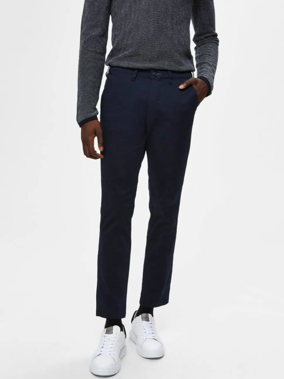 Selectedin miesten housut, jotka valmistettu joustavasta puuvillasekoitteesta. Ajankohtainen kapea istuvuus.