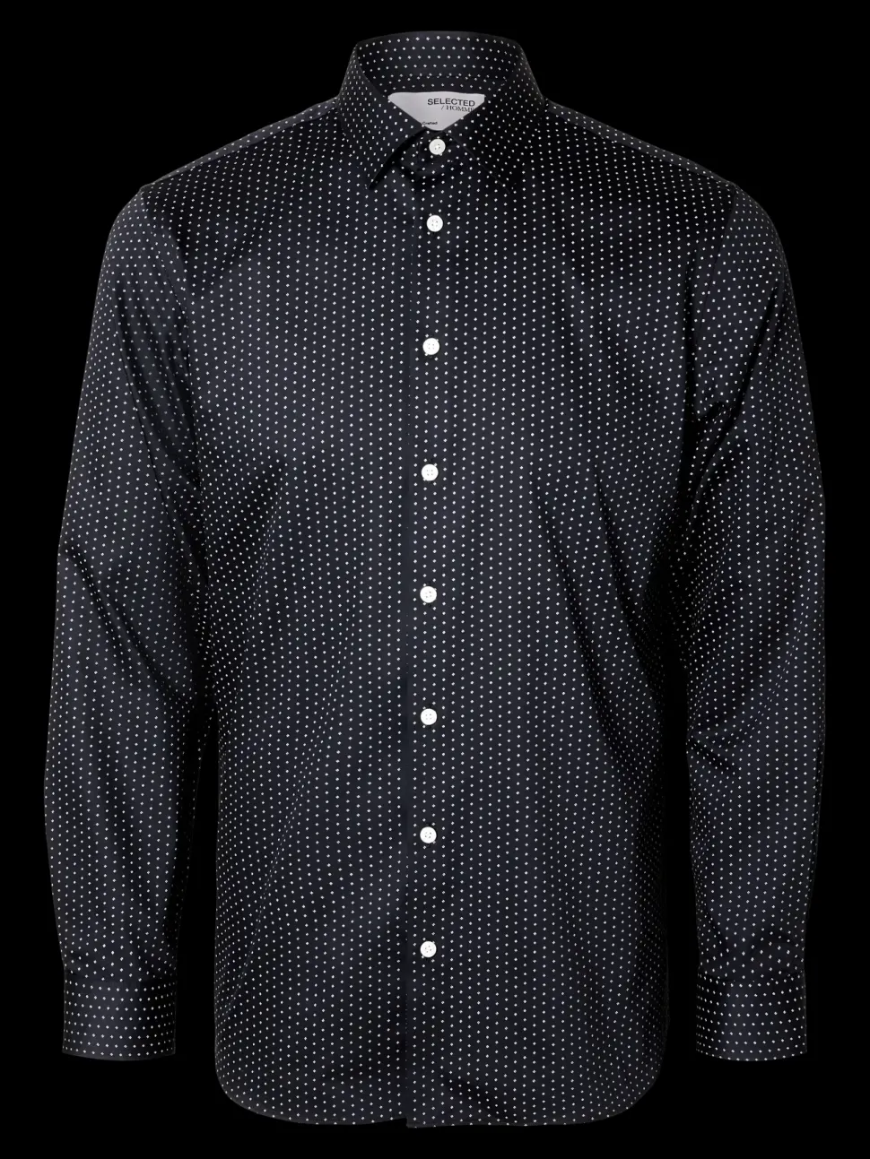 Selectedin kauluspaita nappikiinnityksellä, pitkillä hihoilla ja pyöristetyllä helmalla. Slim fit istuvuus.
