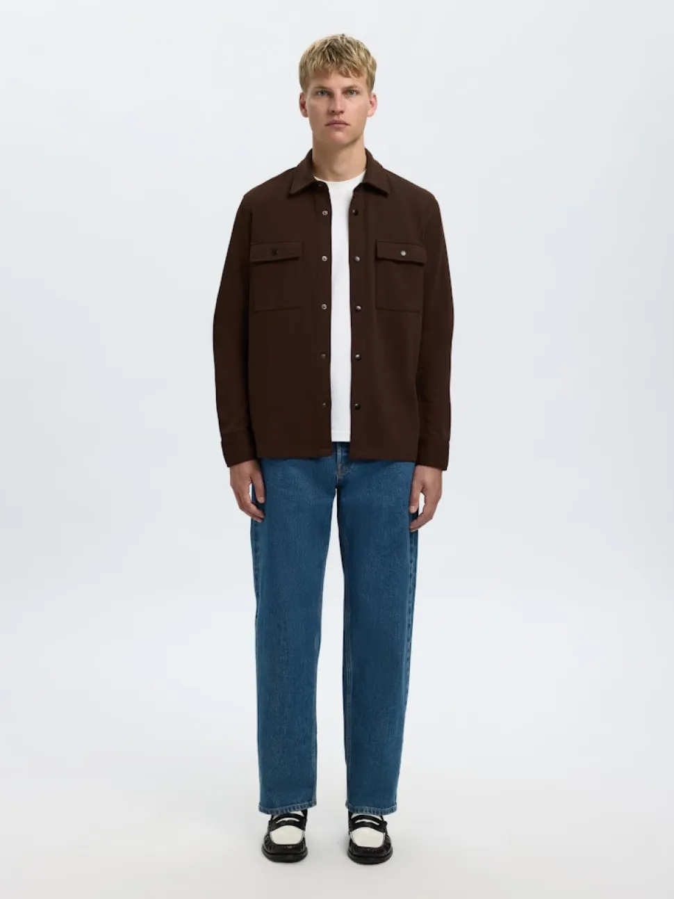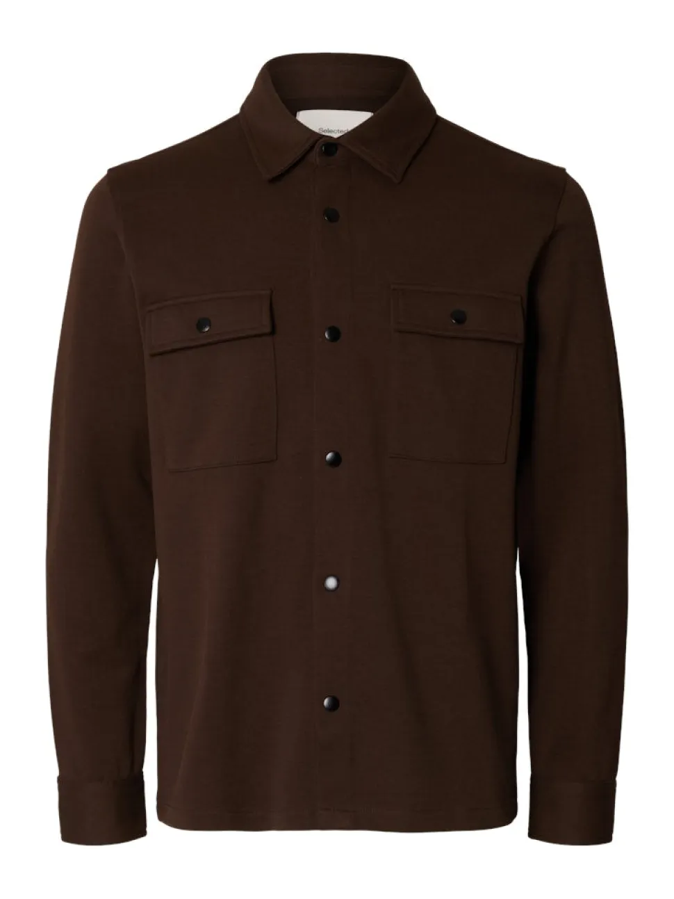 Selectedin rento ja trendikäs paitatakki. Kaulukset ja nepparikiinnitys edessä. Läpälliset rintataskut nepparilla. Materiaali joustavaa ja pehmeää luomupuuvillasekoitetta.