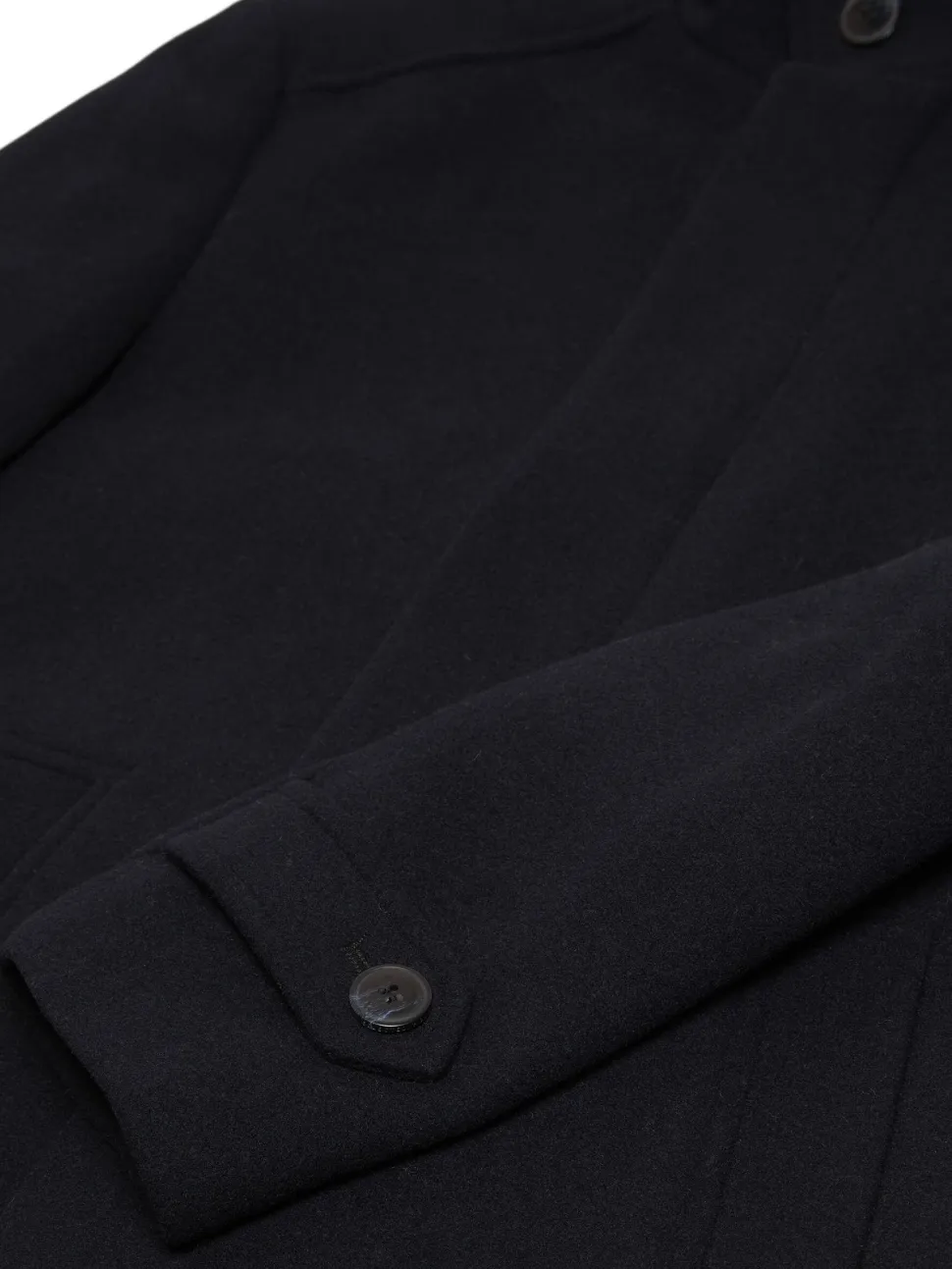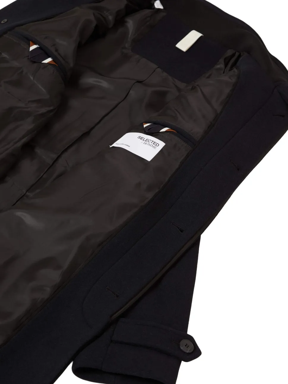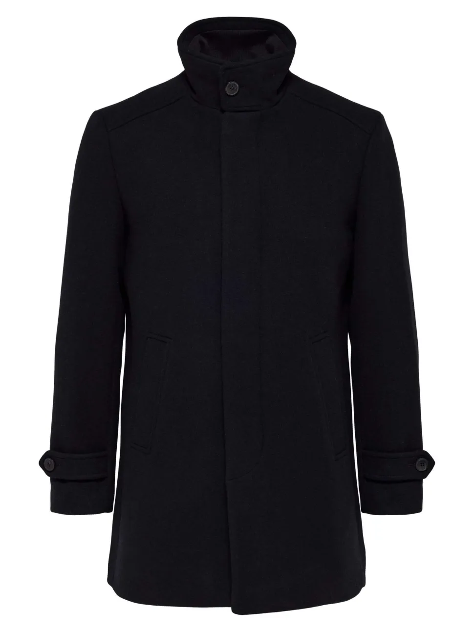 Selectedin miesten korkeakauluksinen villakangastakki. – Korkea kaulus – Napitetut hihansuut – Nappikiinnitys – Mitoitus polven yläpuolelle – Sivutaskut