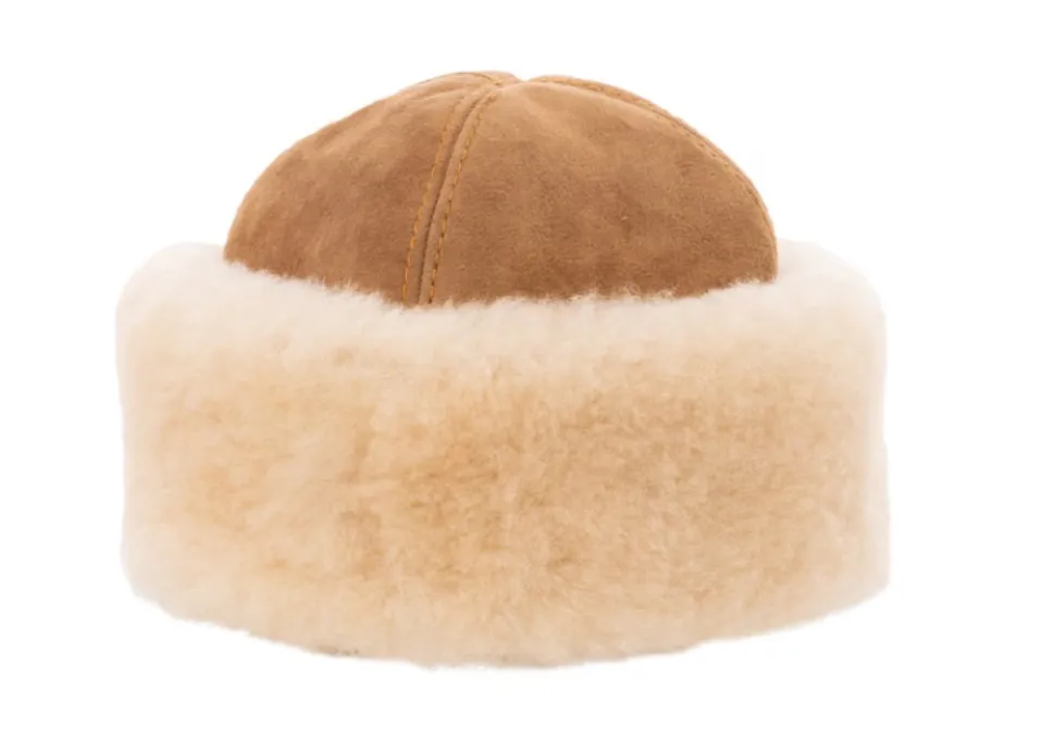 Pehmeä lampaannahkainen hattu, jossa on leveä ja taitettu lieri.