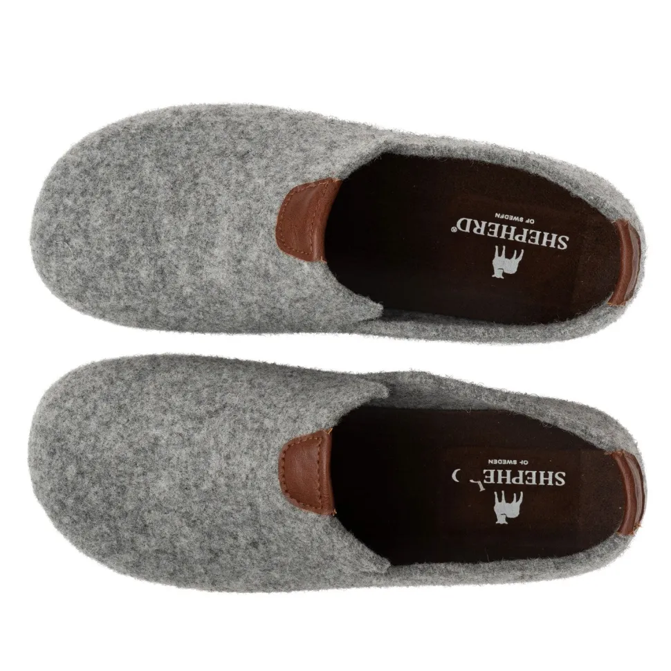 Shepherd Elma on matala nilkkakorkuinen luonnollisesta villasta valmistettu tossu, joka on pehmeä, lämmin ja helppo pukea sivuilla olevien halkioiden ansiosta. Hillityt nahkaiset yksityiskohdat ja sivulla oleva logo antavat yksilöllisen ilmeen.