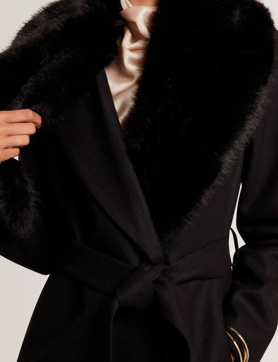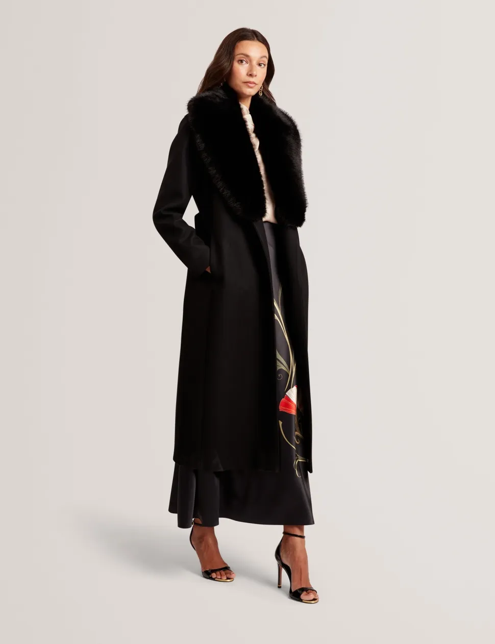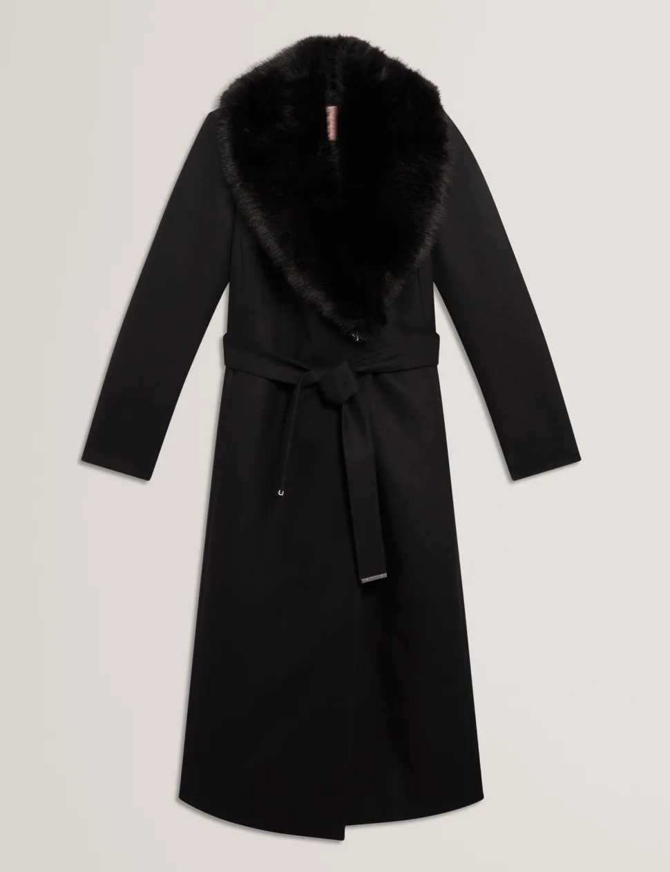 Tyylikäs ja lämmin pitkä Ted Baker Musea -takki yhdistää ylellisyyden ja toiminnallisuuden. Takki on valmistettu laadukkaasta villasekoitteesta, joka tarjoaa mukavan lämmön sekä tyylikkään ulkonäön. Vyö korostaa vyötäröä ja luo naisellisen siluetin, ja irrotettava tekoturkiskaulus tuo ripauksen glamouria ja viimeistelee talvisen ilmeen.