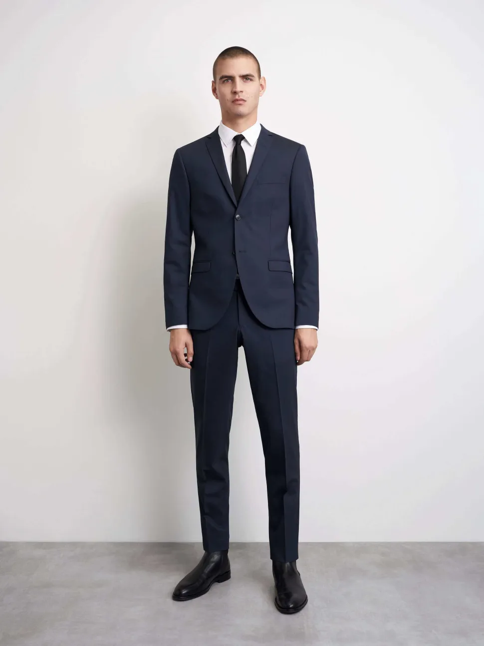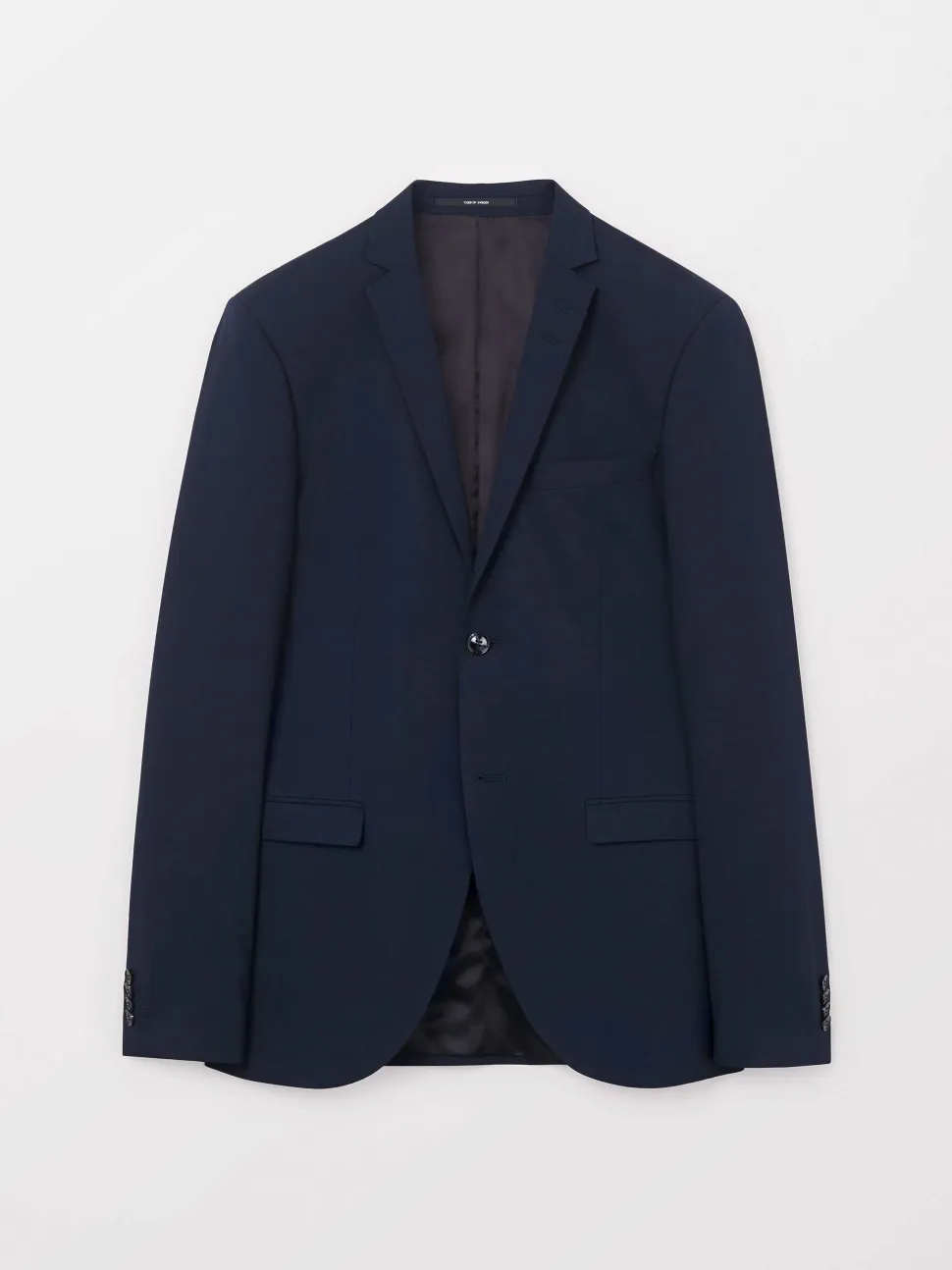 Miesten puvuntakki. Edessä kaksi nappia takin sulkemiseen. Edessä suorat läpälliset taskut. Takki on vuorillinen. Takana sivuhalkiot.