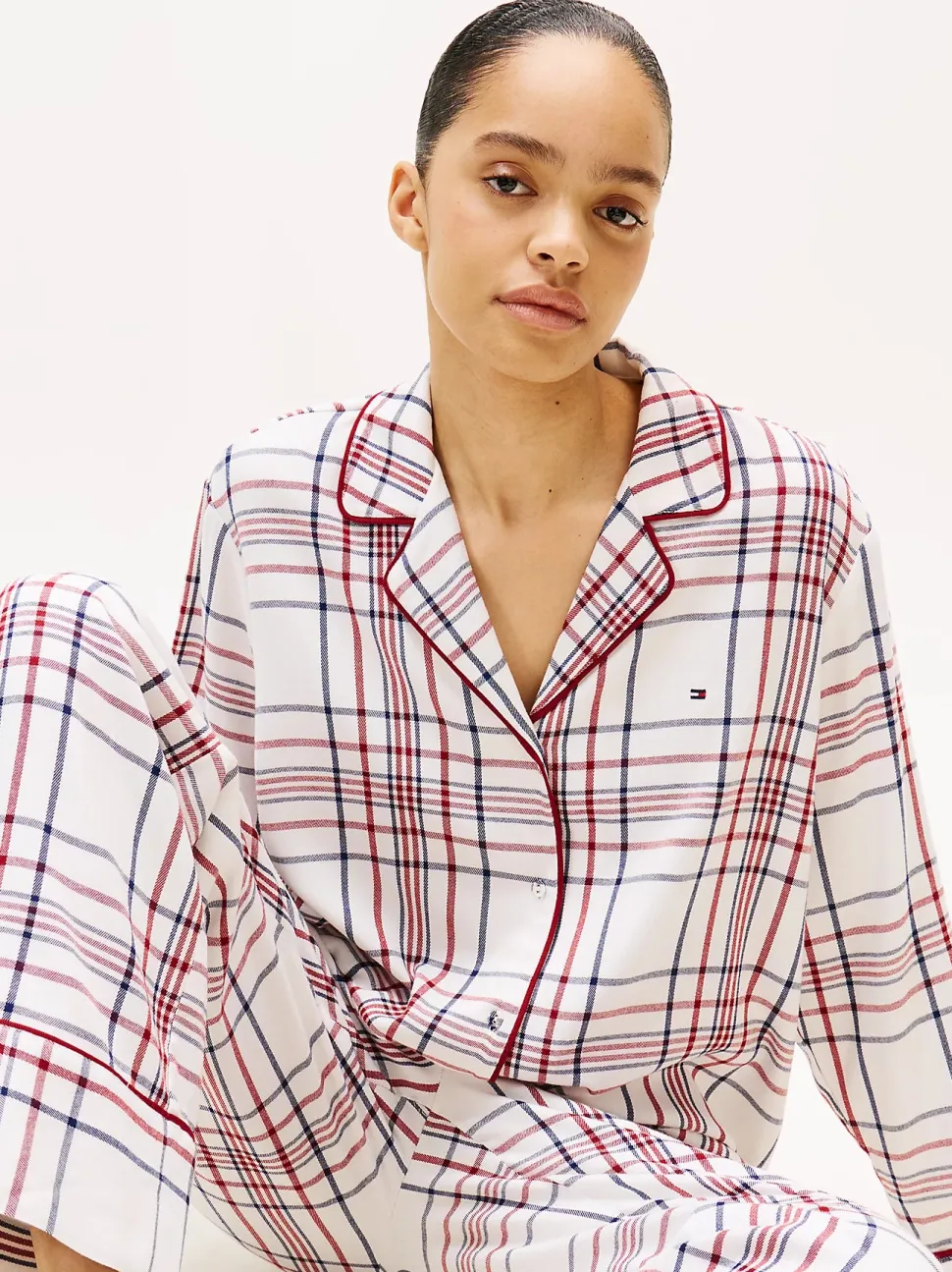 Tämä flanellisetti sisältää pehmeän ruutupaidan kääntökauluksella ja kirjailulla sekä yhteensopivat housut joustavalla vyötäröllä. Tikatut yksityiskohdat, logokirjailu ja ruutukuvio tuovat viimeistellyn ilmeen. Mukava valinta rentoutumiseen tai lahjaksi.