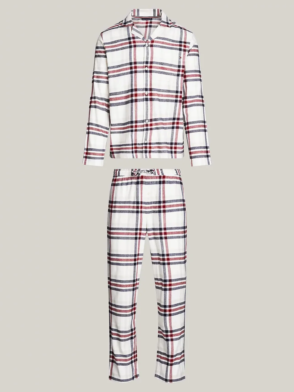 Tommy Hilfigerin rento ja mukava flanellipyjamasetti. Paidassa on puolileveäkaulus ja yksi rintatasku. Housuissa on elastinen nauhavyöträrö ja kaksi sivutaskua.