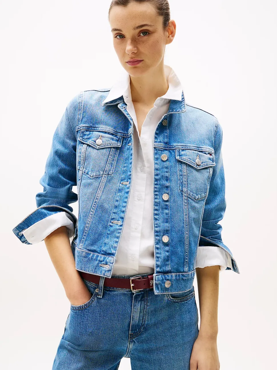 Tämä ajaton takki on valmistettu joustavasta denimistä