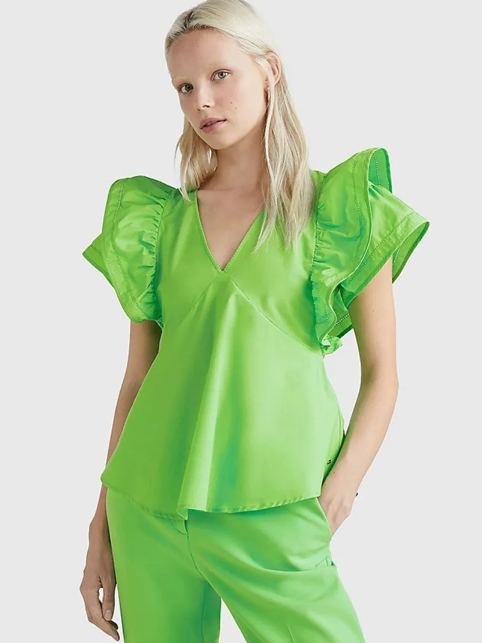Tommy Hilfigerin upea paita. Paidassa näyttävät röyhelöhihat ja kaunis v-pääntie edessä sekä takana. Kaunis kapea leikkaus. Paidan helmassa brändin logomerkkaus.