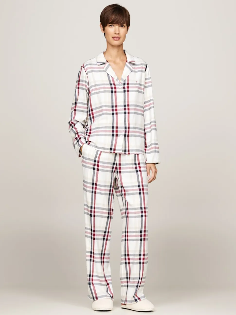 Tommy Hilfigerin rento ja mukava flanellipyjamasetti. Paidassa on puolileveä kaulus ja housuissa löytyy kiristysnauhavyötärö.