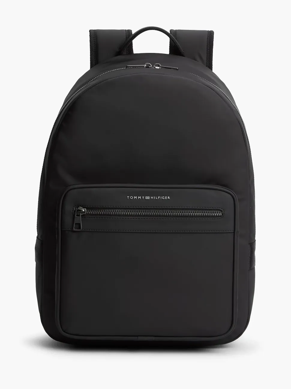 Repun pyöristetty muoto ja sileä pintamateriaali antavat sille hillityn, mutta näyttävän ilmeen, jota täydentää edessä oleva metallinen Tommy Hilfiger ‑logo ja brändäys. Tilava pääosasto suljetaan kaksoisvetoketjulla, ja repussa on myös ulkotasku vetoketjulla pienemmille tarvikkeille. Pehmustetut ja säädettävät olkahihnat sekä mesh‑selkäosa tarjoavat käyttömukavuutta koko päivän kantoon. Lisäksi kantokahva helpottaa nopeaa tarttumista laukkuun.