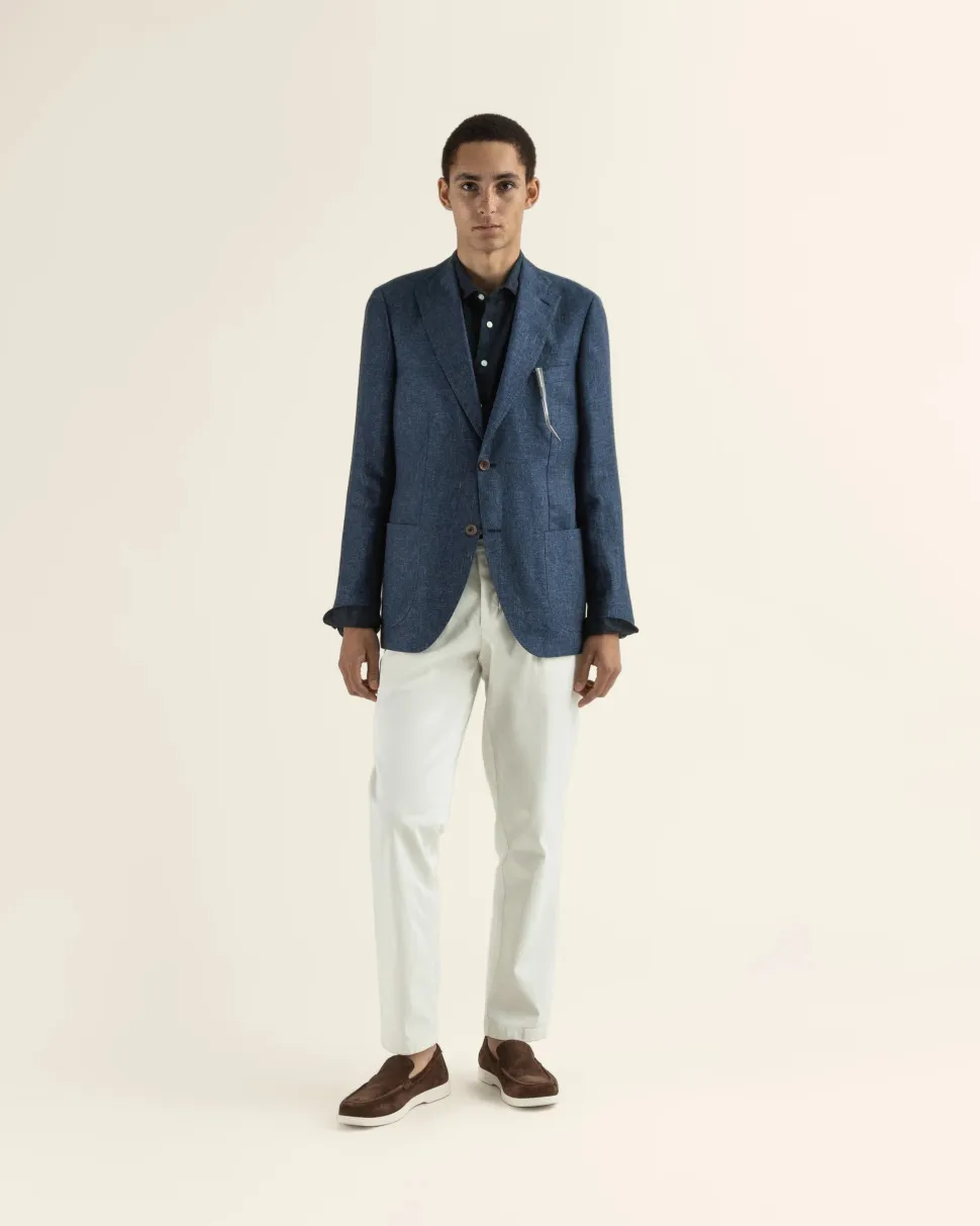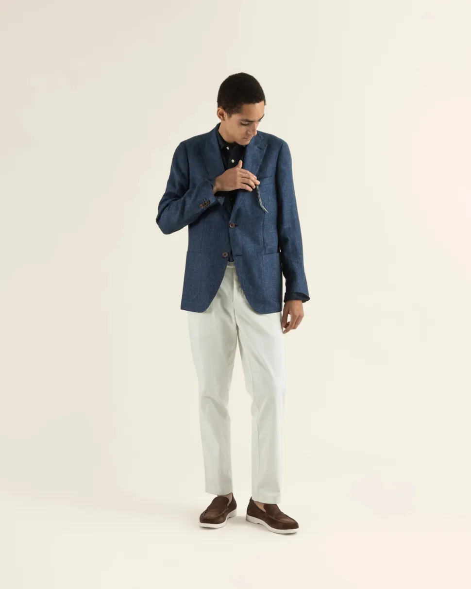 Monikäyttöinen irtotakki laadukkaalla pellavasekoite-kankaalla. Rentoutta takkiin tuo paikkataskujen lisäksi puolivuoritus. Kankaan kesäisen sinisen sävyn ansiosta takki on helppo yhdistää esimerkiksi monien farkkujen tai chinojen kanssa.