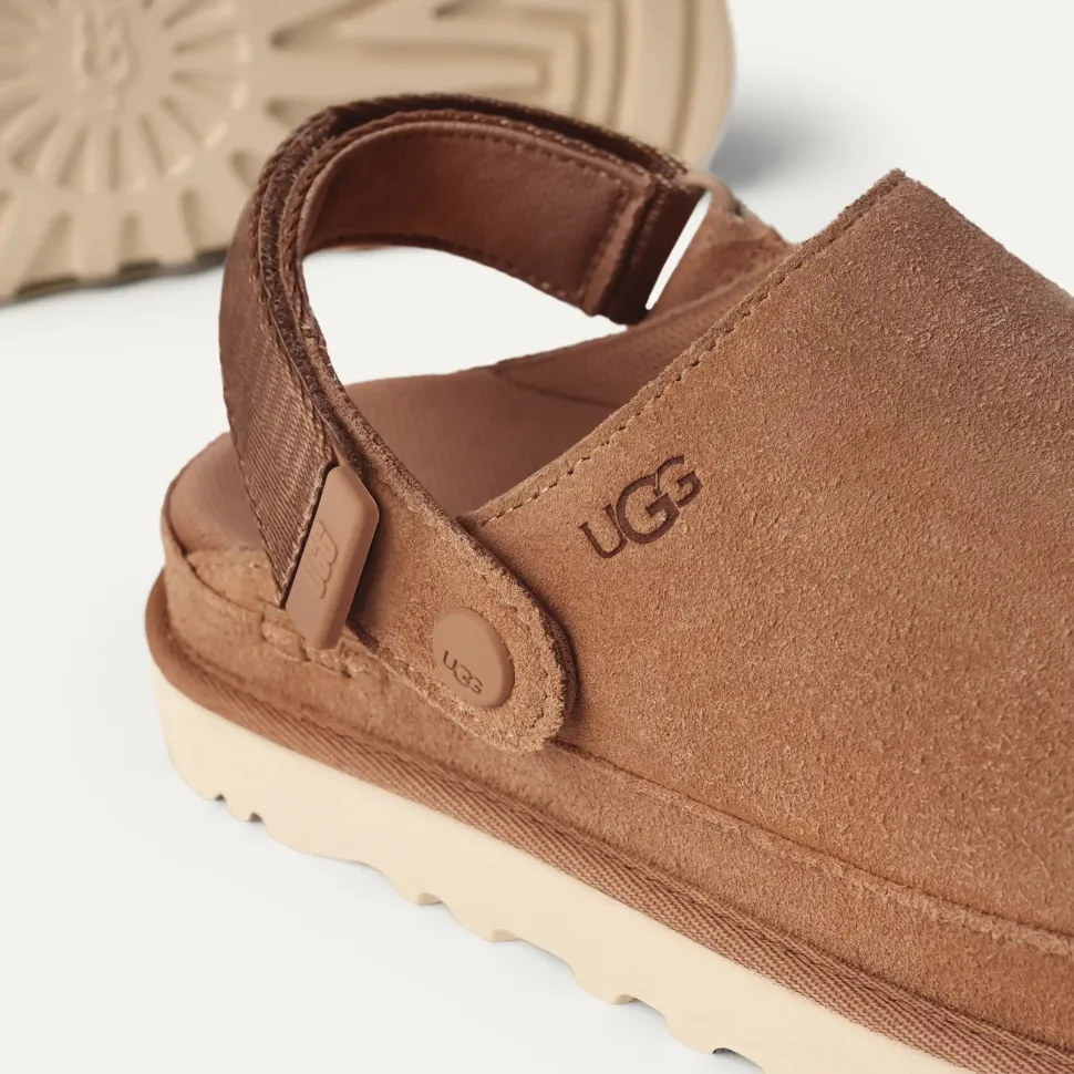 UGG naisten Goldenstar Clog kengät on valmistettu pehmeästä mokkanahasta, ja ne tarjoavat mukavuutta ja pehmeyttä jaloille. Kengissä on umpinainen, pyöristetty kärki sekä tarrakiinnitteinen kantaremmi. Kantaremmin saa helposti käännettyä eteen, jolloin kengistä tulee trendikkäät pistokkaat. Kengissä on erittäin kevyt SugarSole™ ulkopohja sekä tekstiilivuori.
