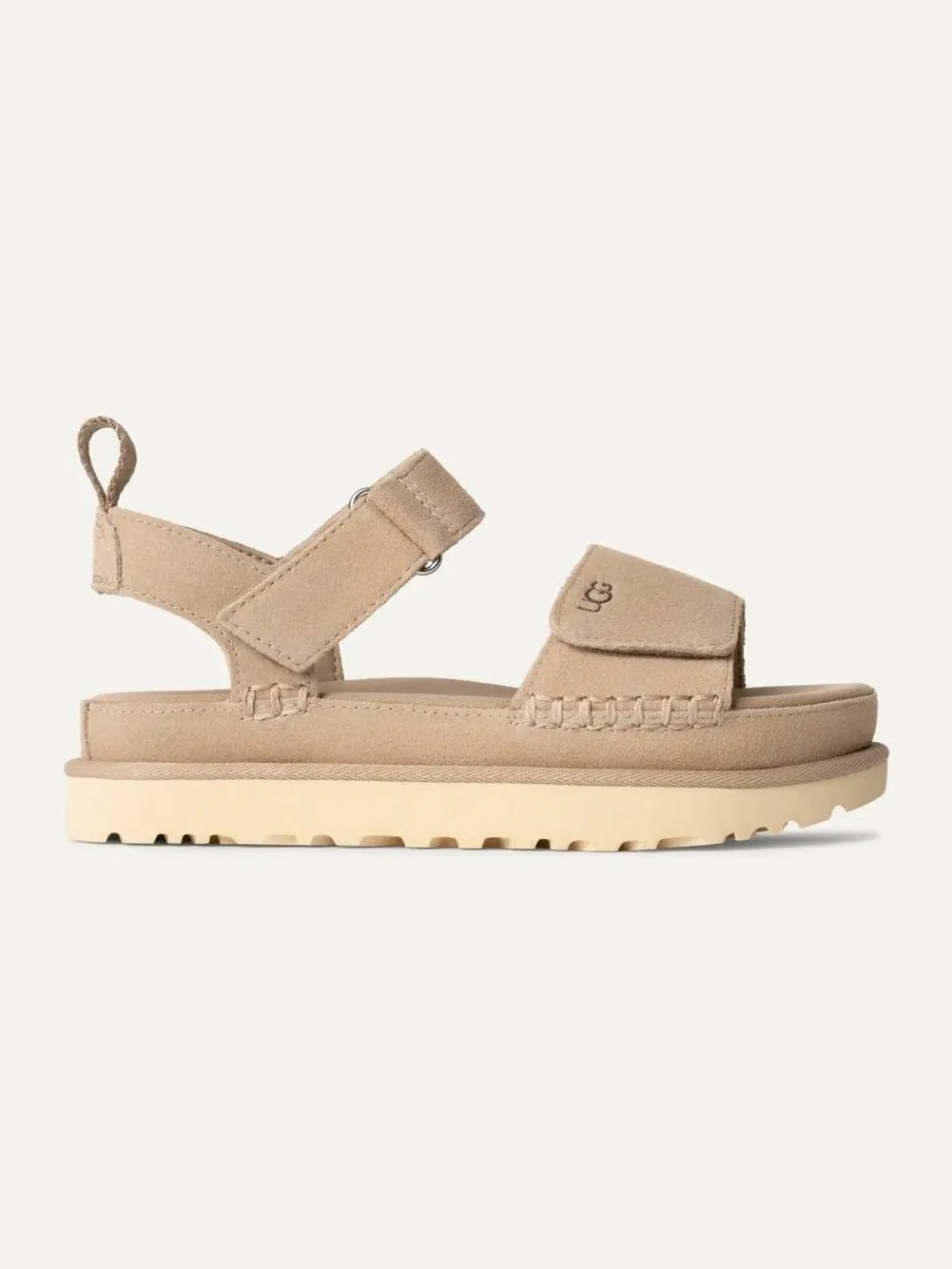 Tämä samettisesta mokkanahkasta valmistettu minimalistinen sandaali on helposti yhdistettävissä monen eri tyylin kanssa. Säädettävä nilkkahihna, koukku ja silmukkakiinnitys Tekstiilivuori 100 % kierrätetyistä polyesterikuiduista Kangas, joka on valmistettu 100 % kierrätetystä polyesterista Muotoiltu EVA-pohjallinen SugarSole™ EVA-välipohja SugarSole™ EVA-ulkopohja Kierrätetty polyesteriside Lämpökokuvioitu UGG®-logo