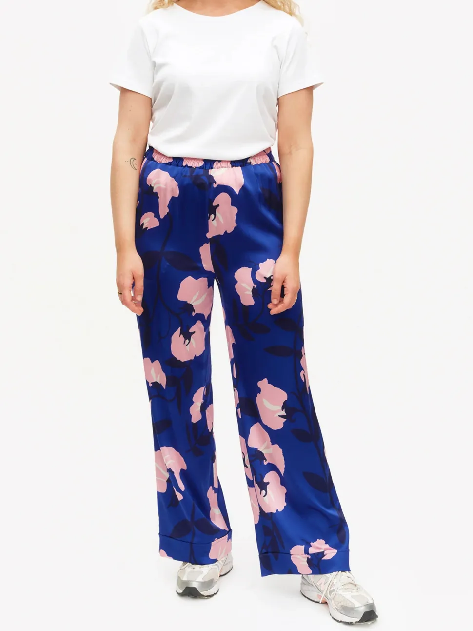 Leveälahkeiset, täyspitkät viskoosisekoitehousut. Leveät taitokset lahkeensuissa, sivutaskut ja korkea kuminauhavyötärö. Kankaassa on himmeä hohde ja silkkimäinen tuntu.