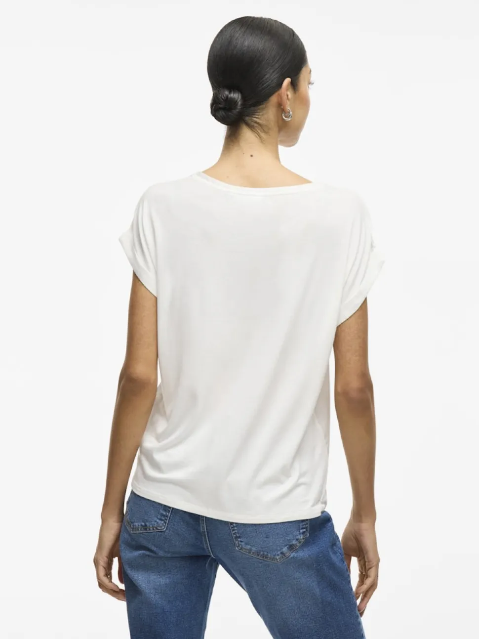 – Lyhythihainen toppi, jossa on pyöreä kaula-aukko – Satiinimainen pinta – Kevyttä materiaalia – Joustamatonta materiaalia – Pituus: 61 cm (koko 38) – Hihojen pituus: 11 cm (koko 38) – Malli on 178 cm pitkä, yllä koko 38.