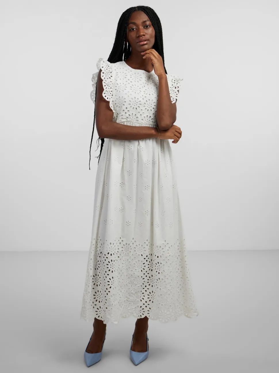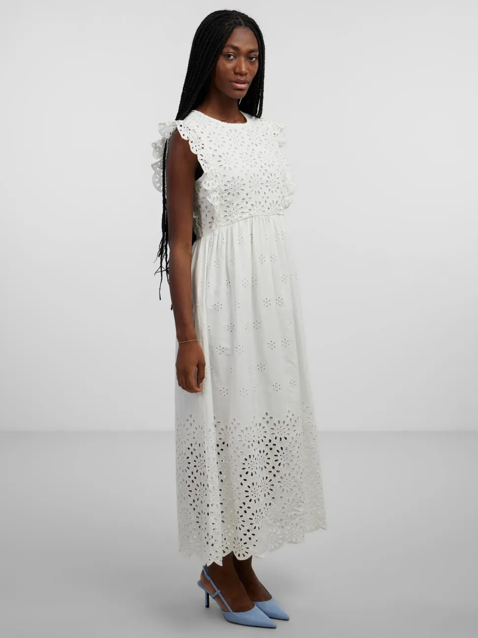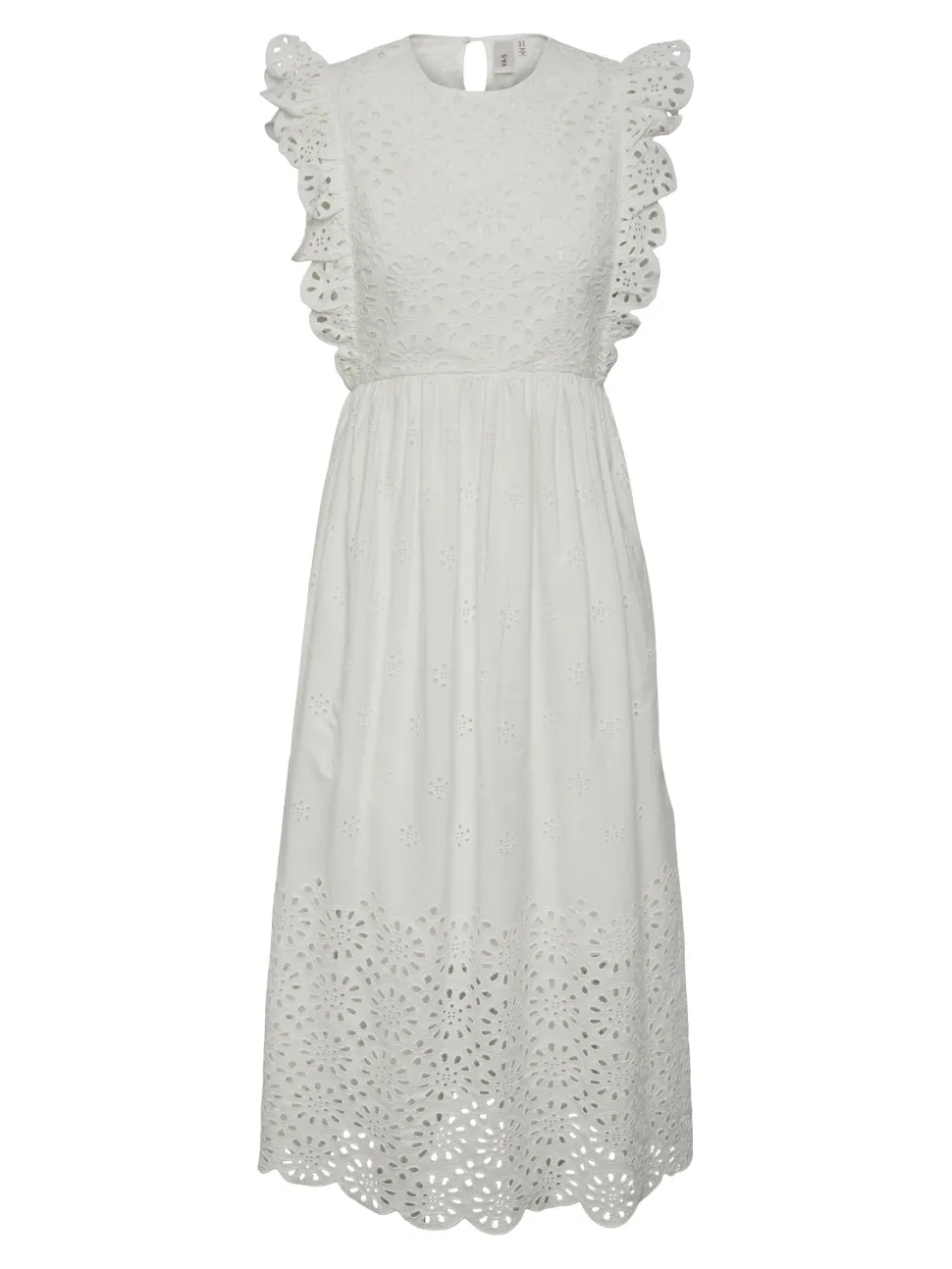 Lisäyksityiskohdat: Vyötäröllä leikkauslinja, röyhelöt naiselliseen reunaan, Broderie anglaise -yksityiskohta
