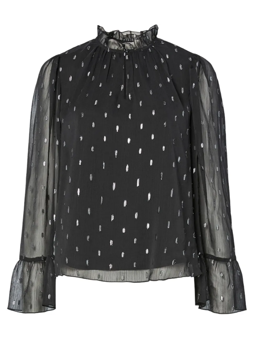Y.A.S Mena LS Top on tyylikäs pitkähihainen paita, joka on valmistettu kevyestä materiaalista. Siinä on korkea pääntie ja pitkät läpikuultavat hihat, jotka tuovat ilmettä ja keveyttä asuun. Paidassa on hillityt hopeiset pilkut. Täydellinen valinta näyttävään ja mukavaan pukeutumiseen.