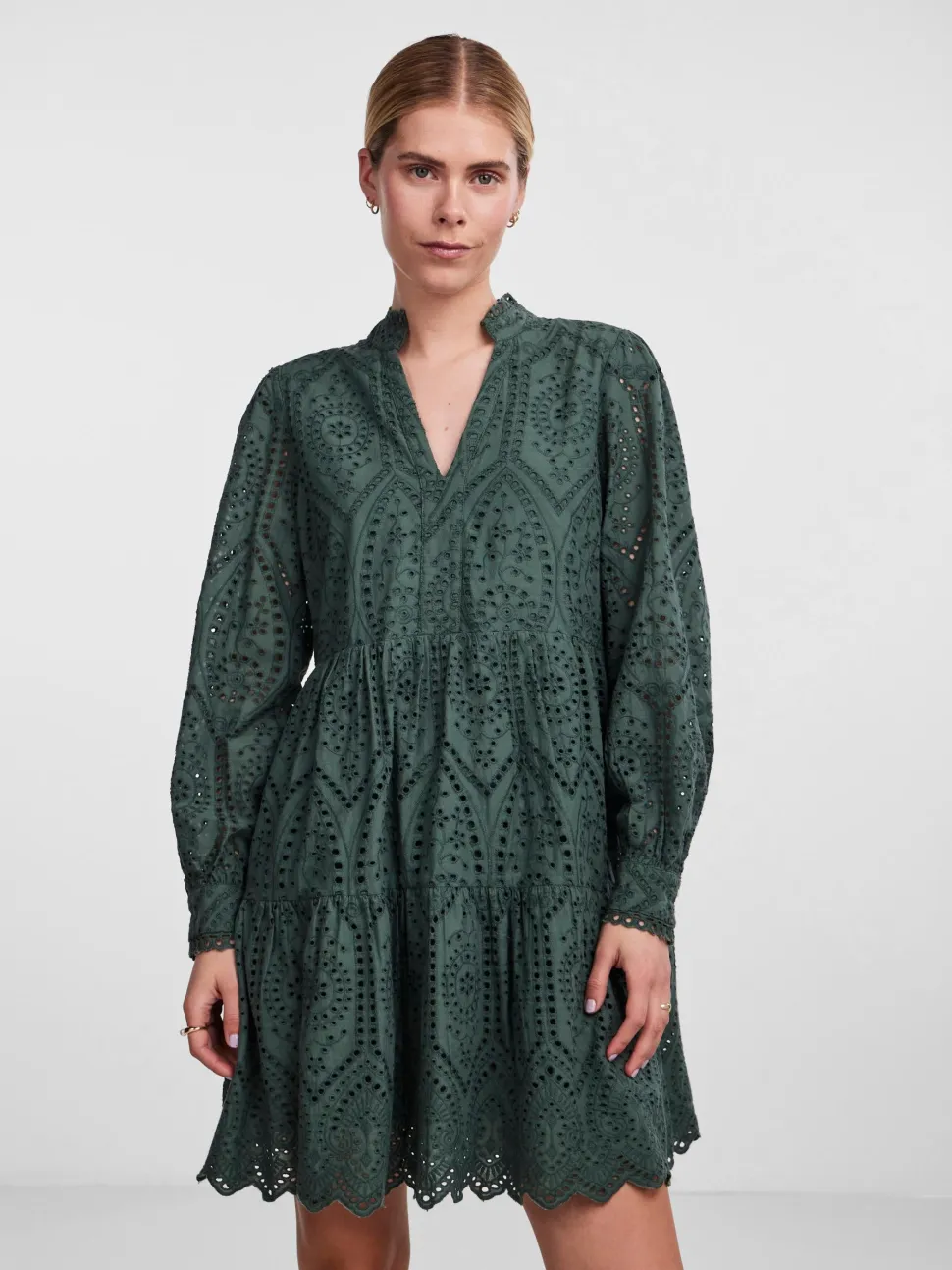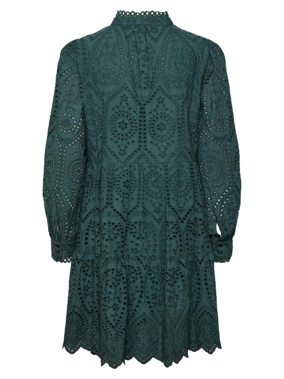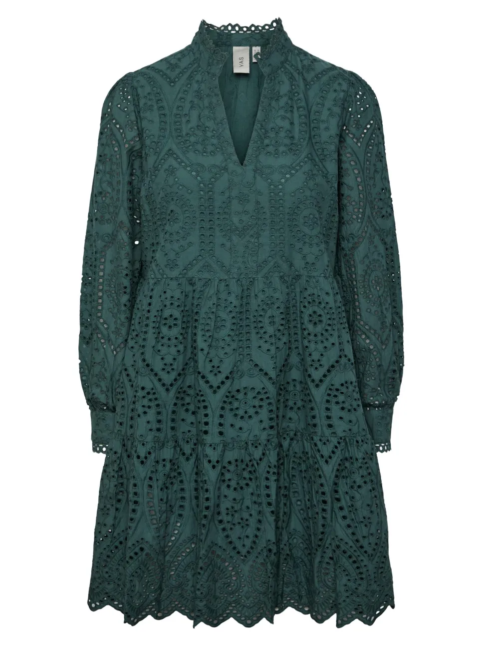 Röyhelöreunainen kiinalaiskaulus, v-pääntie, pallohihat. Hihansuissa röyhelöreunaiset kalvosimet. Kerrostettu helma, jossa brodeerattu siksakmuoto. Mekossa on vuori. Rento istuvuus.