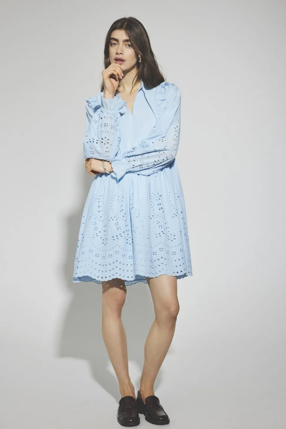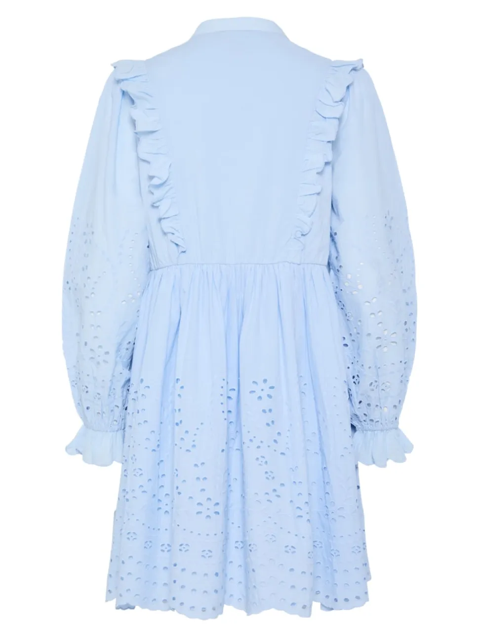 Tämä mekko on valmistettu herkästä broderie anglaise -kankaasta, jonka kankaassa on kauniita brodeerauksia.