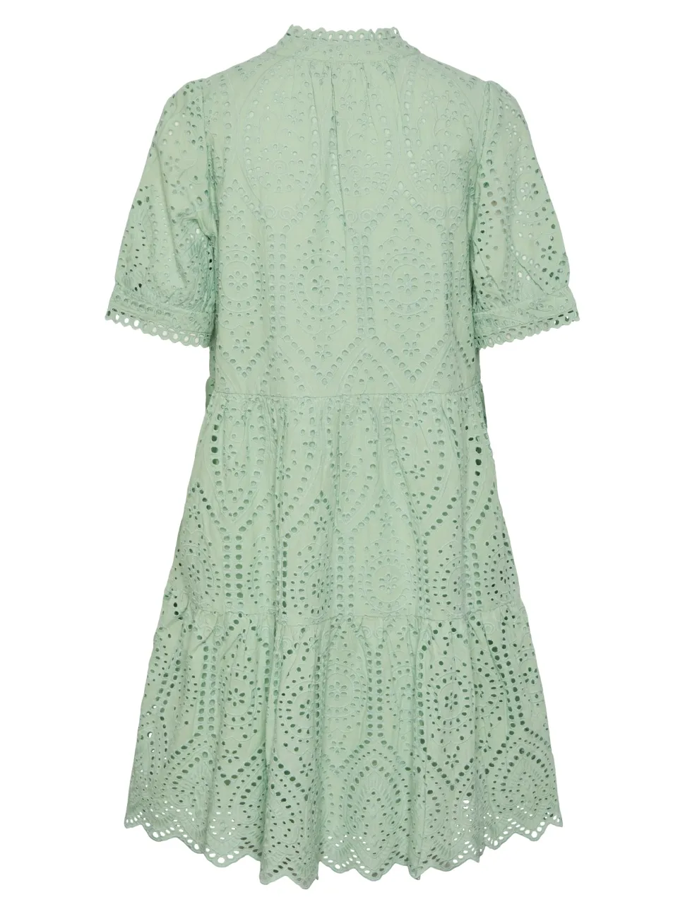 Naisten kaunis minimekko brodeerattua luomupuuvillakangasta. Lyhyet väljät hihat, hieman nouseva kaulus ja edessä v-pääntie. Alaosassa kerroksellisuutta ja ihana piparkakkureunus helmassa. Alla puuvillavuori. Normaali istuvuus. .
