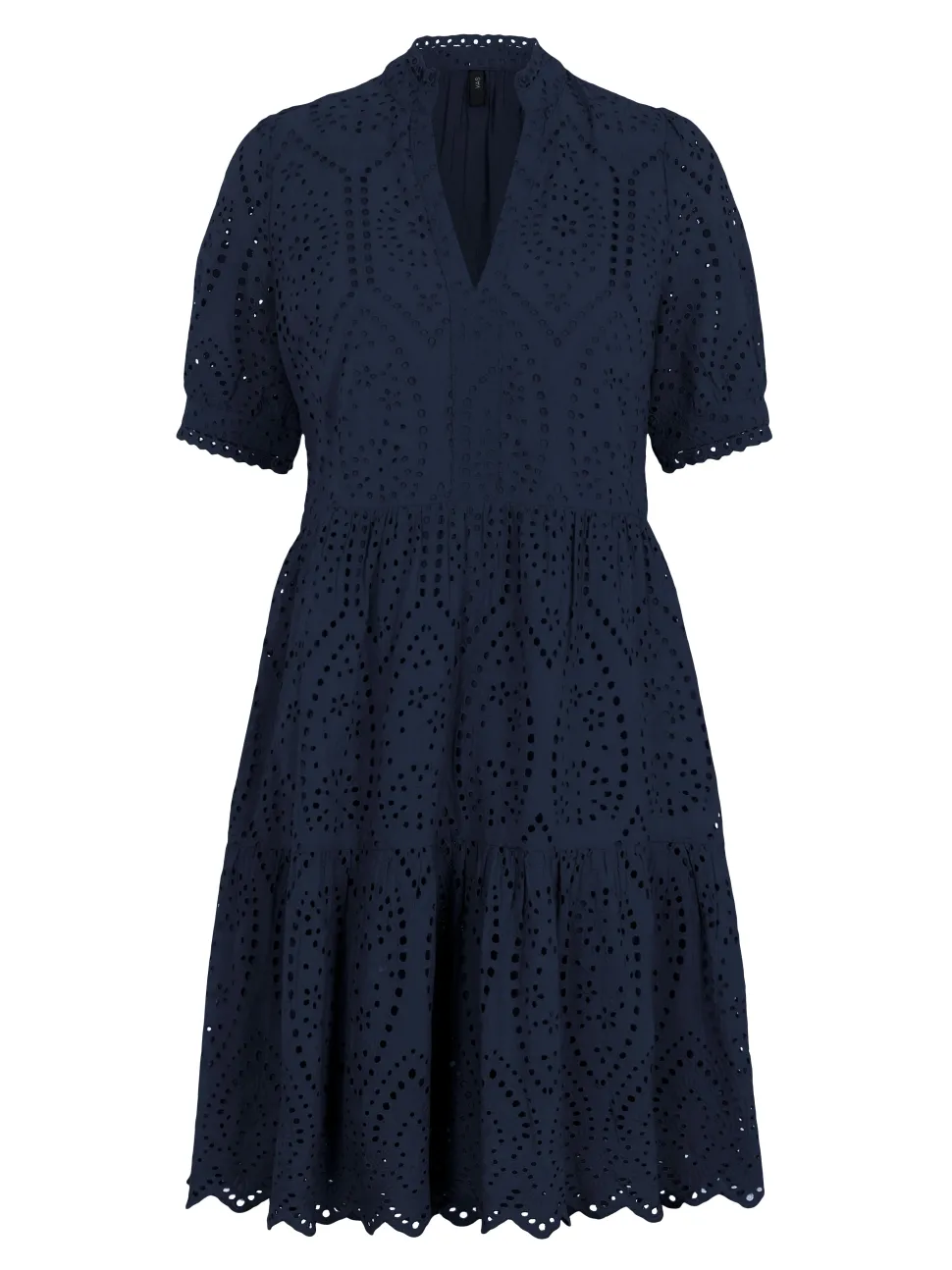Naisten kaunis minimekko brodeerattua luomupuuvillakangasta. Lyhyet väljät hihat, hieman nouseva kaulus ja edessä v-pääntie. Alaosassa kerroksellisuutta ja ihana piparkakkureunus helmassa. Alla puuvillavuori. Normaali istuvuus. .