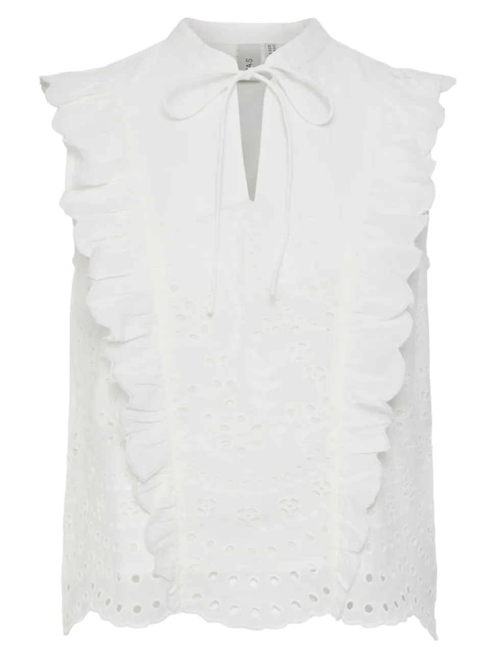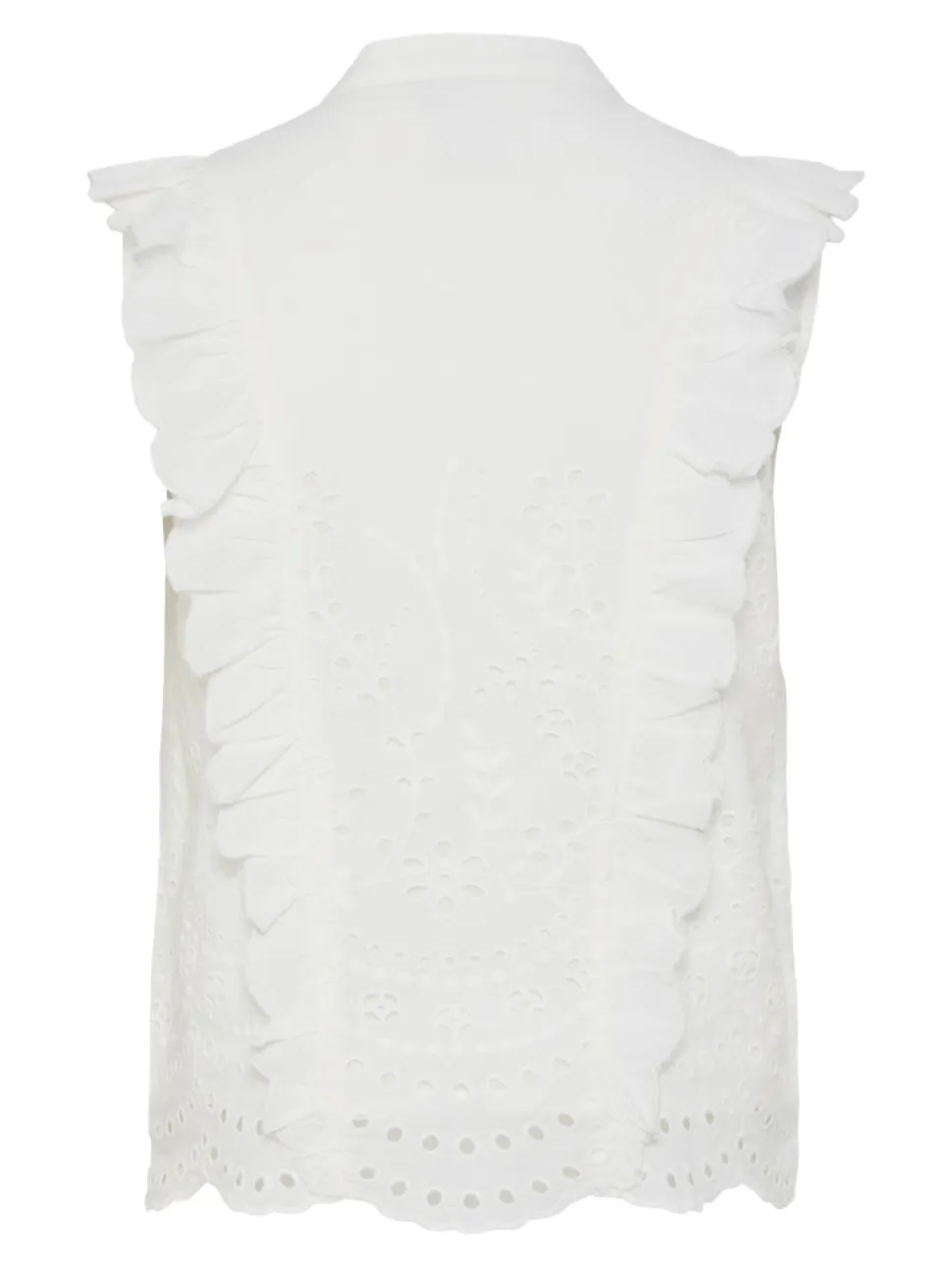 Tämä toppi on valmistettu herkästä broderie anglaise -kankaasta, jonka kankaassa on kauniita brodeerauksia.