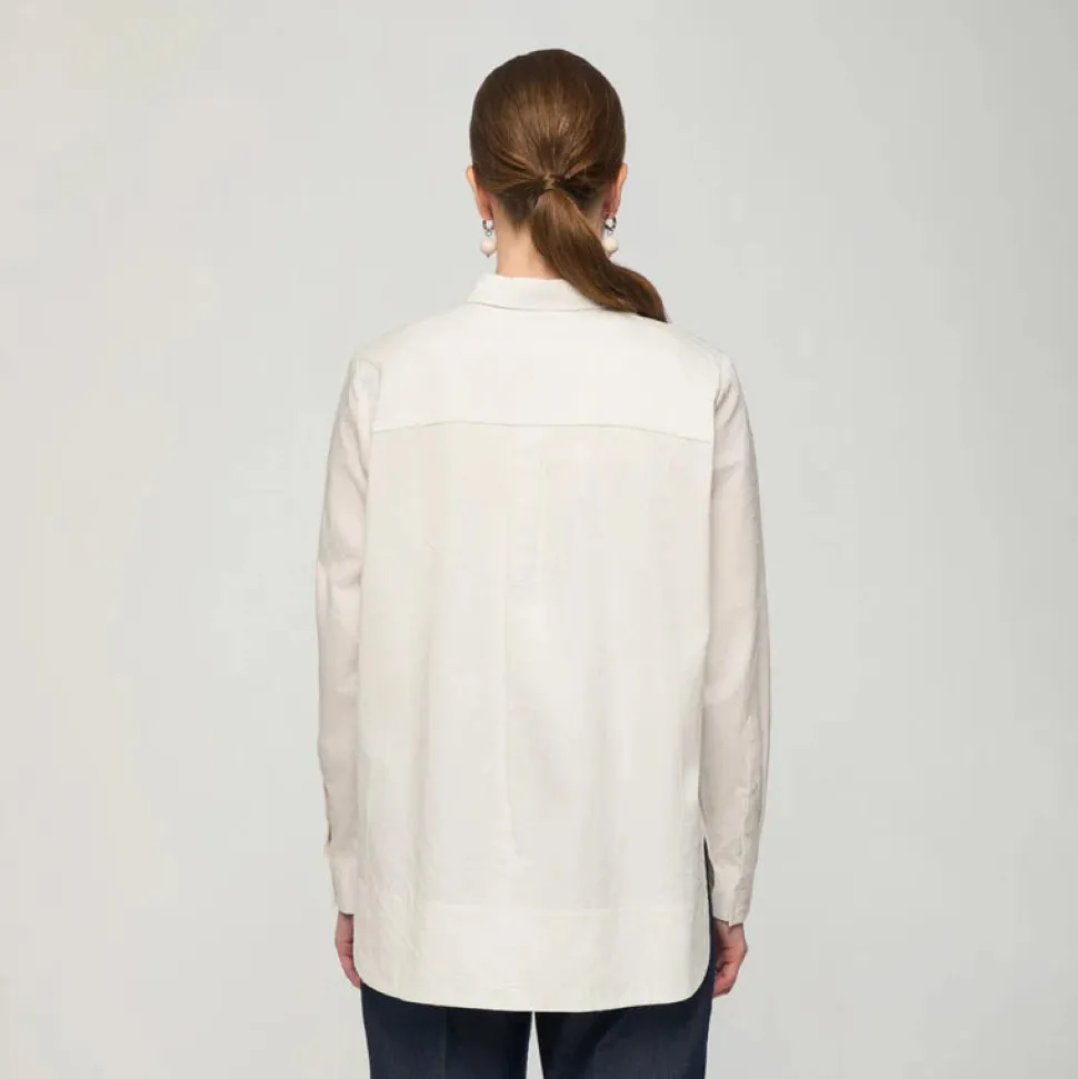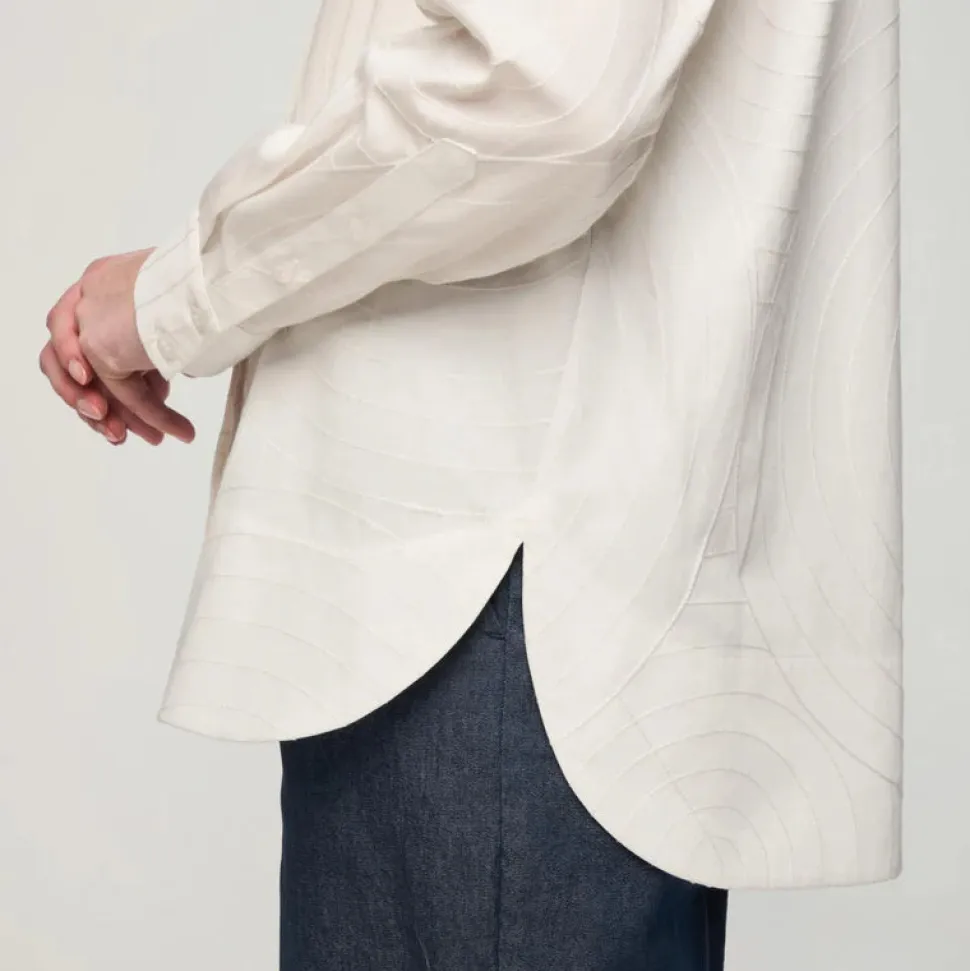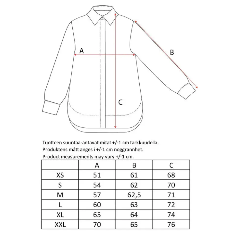Leila-kauluspaidassa on väljän rento malli, piilonapitus edessä, pitkät hihat ja kauniisti pyöristetty helma. Paitaan on brodeerattu valkoisella Aarikan pyöreitä muotoja toistava kuvio. Leila-paita on luottovaate, joka sopii yhdisteltäväksi moneen alaosaan.