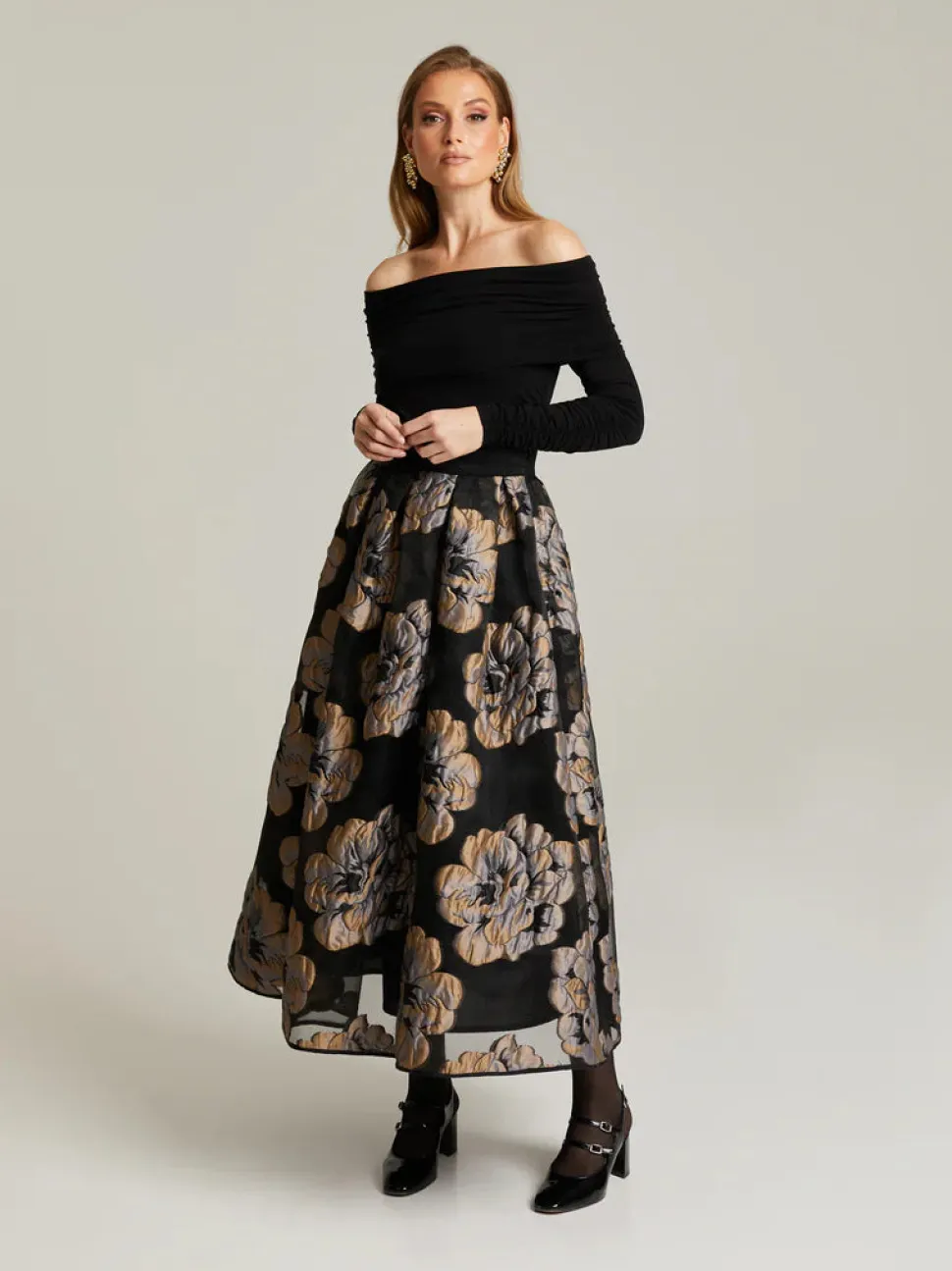 Pohjemittainen hame, jossa näyttävä helma ja laskostukset. Valmistettu ylellisestä ruusukuosisesta cloque-kankaasta. Piilovetoketju sivussa. Hameessa on vuori.