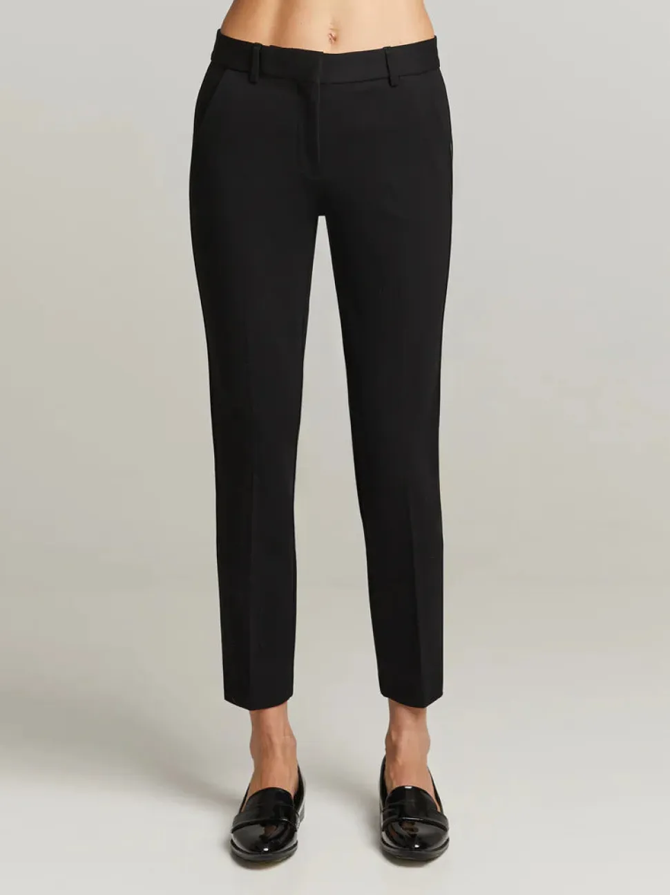 Klassiset nilkkapituiset, kapealinjaiset mustat housut paksusta ja joustavasta, miellyttävän tuntuisesta jersey-kankaasta. Keskikorkea vyötärö, vyölenkit ja sivutaskut. Vetoketju sekä piilotettu hakas- ja nappikiinnitys edessä.