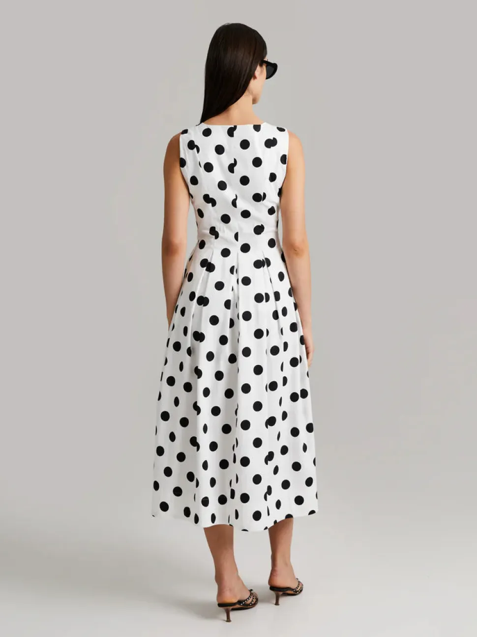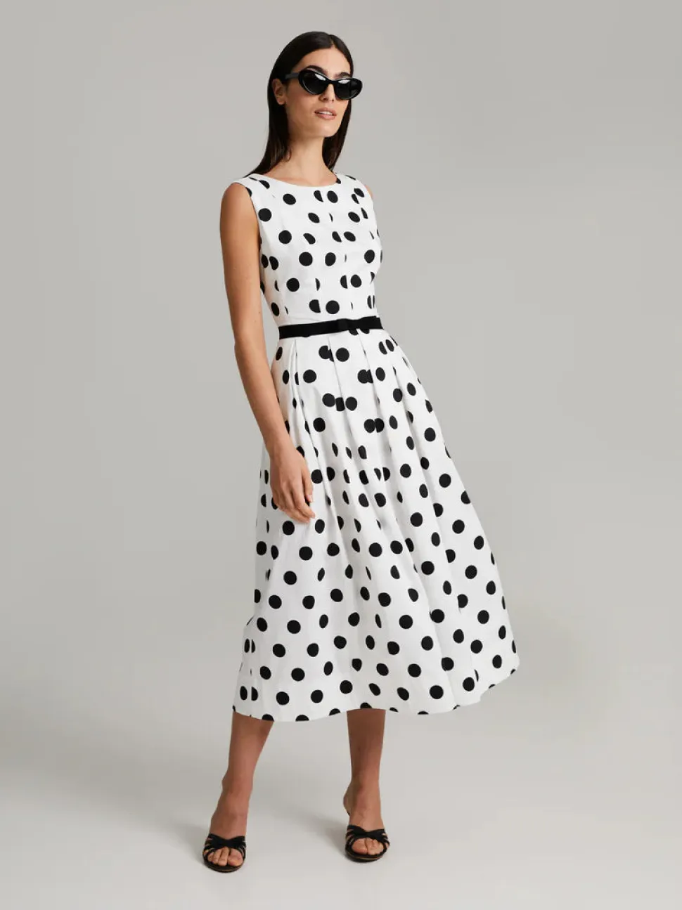 Ajaton midi-mittainen mekko. Tyköistuva, hihaton yläosa, ja A-linjainen helma eleganteilla laskostuksilla. Pyöreä pääntie, piilotaskut sivuilla ja piilovetoketju sivussa. Valmistettu italialaisesta puuvillasatiinista.