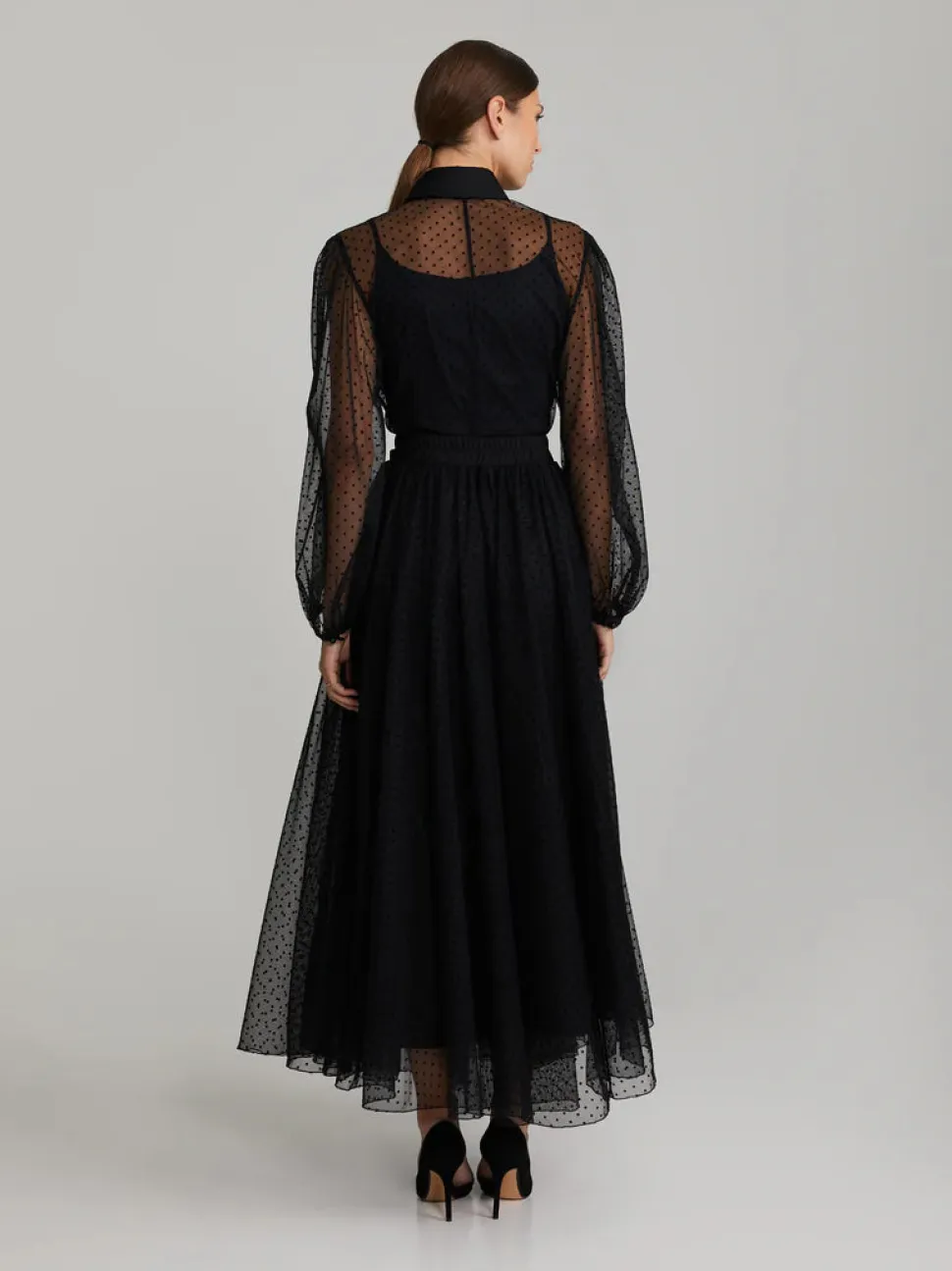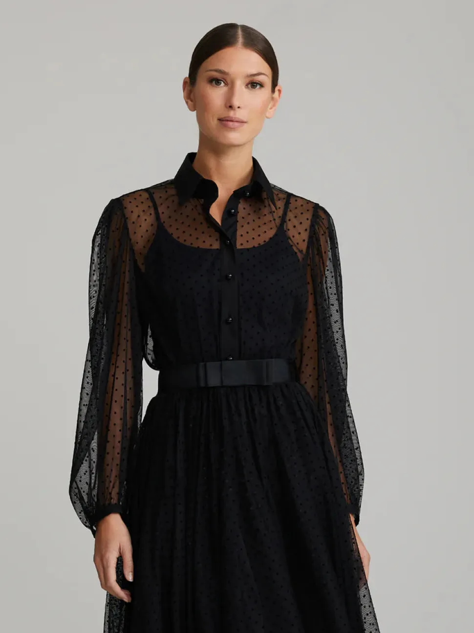Läpikuultava, pilkullinen paita, jossa on nappikiinnitys edessä, kaulukset ja hieman puffimaiset hihat.