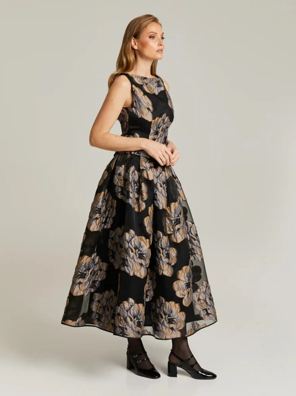 Kauniisti istuva toppi, jossa elegantti venepääntie. Valmistettu ylellisestä cloque-kankaasta, jossa kaunis kukkakuosi. Paita on täysin vuorattu, ja siinä on piilovetoketju sivussa.